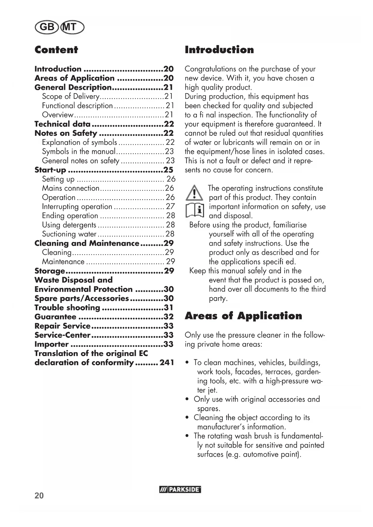 - 13 Water connection 14 Jet gun 15 Holder for spray gu 16 Accessories holder (not visible) 17 Holder for nozzle cleaning nee- dle (not visible) 18 Operating pressure gauge (not visible) 19 Starting lever 20 Locking button 21 Rotating wash brush 22 Quick connector for garden hose adaptor 23 Sealing cap with suction hose 24 Cleaning agent container 25 Standard Vario nozzle 26 Turbo dirt miller 27 High-pressure tting 28 Release button 29 High-pressure tting (gun) 30 Nozzle cleaning needle 31 Cleaning agent This equipment is not suitable for commer- cial use. Commercial use will invalidate the guarantee. General Description The diagram of the most im- portant functional elements can be found on the foldout side. Scope of Delivery Unpack the pressure cleaner and verify the contents: - Pressure cleaner with mains cable - Quick connector for garden hose adap- tor (22) - Jet gun (14) - Lance (3) - Standard Vario nozzle (25) - Turbo dirt miller (26) - Rotating wash brush (21) - Nozzle cleaning needle (30) - Water connection coupling (12) and sieve insert (12.1) - 0.5 l cleaning agent - Instructions for use Dispose of the packaging material cor- rectly. Functional description The pressure cleaner cleans by means of a water jet, with a choice of high or low pressure operation. A detergent can be added if this is re- quired. For the functions of the operating elements please refer to the subsequent description. Ensure that the safety instructions are al- ways observed!22 GB MT Technical data Pressure washer