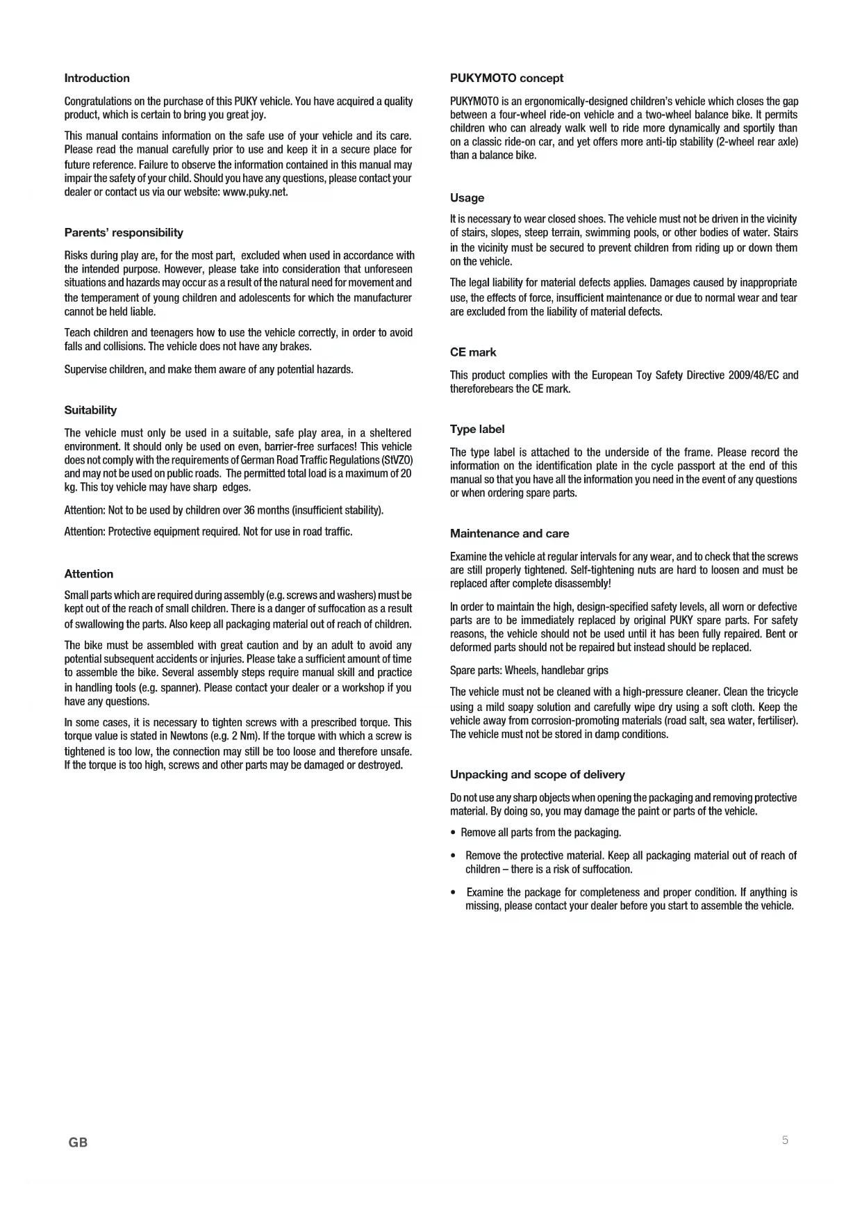 Introduction Congratulations on the purchase of this PUKY vehicle. You have acquired a quality product, which is certain to bring you great joy. This manual contains information on the safe use of your vehicle and its care. Please read the manual carefully prior to use and keep it in a secure place for future reference. Failure to observe the information contained in this manual may impair the safety of your child. Should you have any questions, please contact your dealer or contact us via our website: www.puky.net. Parents’ responsibility Risks during play are, for the most part, excluded when used in accordance with the intended purpose. However, please take into consideration that unforeseen situations and hazards may occur as a result of the natural need for movement and the temperament of young children and adolescents for which the manufacturer cannot be held liable. Teach children and teenagers how to use the vehicle correctly, in order to avoid falls and collisions. The vehicle does not have any brakes. Supervise children, and make them aware of any potential hazards. Suitability The vehicle must only be used in a suitable, safe play area, in a sheltered environment. It should only be used on even, barrier-free surfaces! This vehicle does not comply with the requirements of German Road Trac Regulations (StVZO) and may not be used on public roads. The permitted total load is a maximum of 20 kg. This toy vehicle may have sharp edges. Attention: Not to be used by children over 36 months (insucient stability). Attention: Protective equipment required. Not for use in road trac. Attention Small parts which are required during assembly (e.g. screws and washers) must be kept out of the reach of small children. There is a danger of suocation as a result of swallowing the parts. Also keep all packaging material out of reach of children. The bike must be assembled with great caution and by an adult to avoid any potential subsequent accidents or injuries. Please take a sucient amount of time to assemble the bike. Several assembly steps require manual skill and practice in handling tools (e.g. spanner). Please contact your dealer or a workshop if you have any questions. In some cases, it is necessary to tighten screws with a prescribed torque. This torque value is stated in Newtons (e.g. 2 Nm). If the torque with which a screw is tightened is too low, the connection may still be too loose and therefore unsafe. If the torque is too high, screws and other parts may be damaged or destroyed. PUKYMOTO concept PUKYMOTO is an ergonomically-designed children’s vehicle which closes the gap between a four-wheel ride-on vehicle and a two-wheel balance bike. It permits children who can already walk well to ride more dynamically and sportily than on a classic ride-on car, and yet oers more anti-tip stability (2-wheel rear axle) than a balance bike. Usage It is necessary to wear closed shoes. The vehicle must not be driven in the vicinity of stairs, slopes, steep terrain, swimming pools, or other bodies of water. Stairs in the vicinity must be secured to prevent children from riding up or down them on the vehicle. The legal liability for material defects applies. Damages caused by inappropriate use, the eects of force, insucient maintenance or due to normal wear and tear are excluded from the liability of material defects. CE mark This product complies with the European Toy Safety Directive 2009/48/EC and thereforebears the CE mark. Type label The type label is attached to the underside of the frame. Please record the information on the identification plate in the cycle passport at the end of this manual so that you have all the information you need in the event of any questions or when ordering spare parts. Maintenance and care Examine the vehicle at regular intervals for any wear, and to check that the screws are still properly tightened. Self-tightening nuts are hard to loosen and must be replaced after complete disassembly! In order to maintain the high, design-specified safety levels, all worn or defective parts are to be immediately replaced by original PUKY spare parts. For safety reasons, the vehicle should not be used until it has been fully repaired. Bent or deformed parts should not be repaired but instead should be replaced. Spare parts: Wheels, handlebar grips The vehicle must not be cleaned with a high-pressure cleaner. Clean the tricycle using a mild soapy solution and carefully wipe dry using a soft cloth. Keep the vehicle away from corrosion-promoting materials (road salt, sea water, fertiliser). The vehicle must not be stored in damp conditions. Unpacking and scope of delivery Do not use any sharp objects when opening the packaging and removing protective material. By doing so, you may damage the paint or parts of the vehicle.