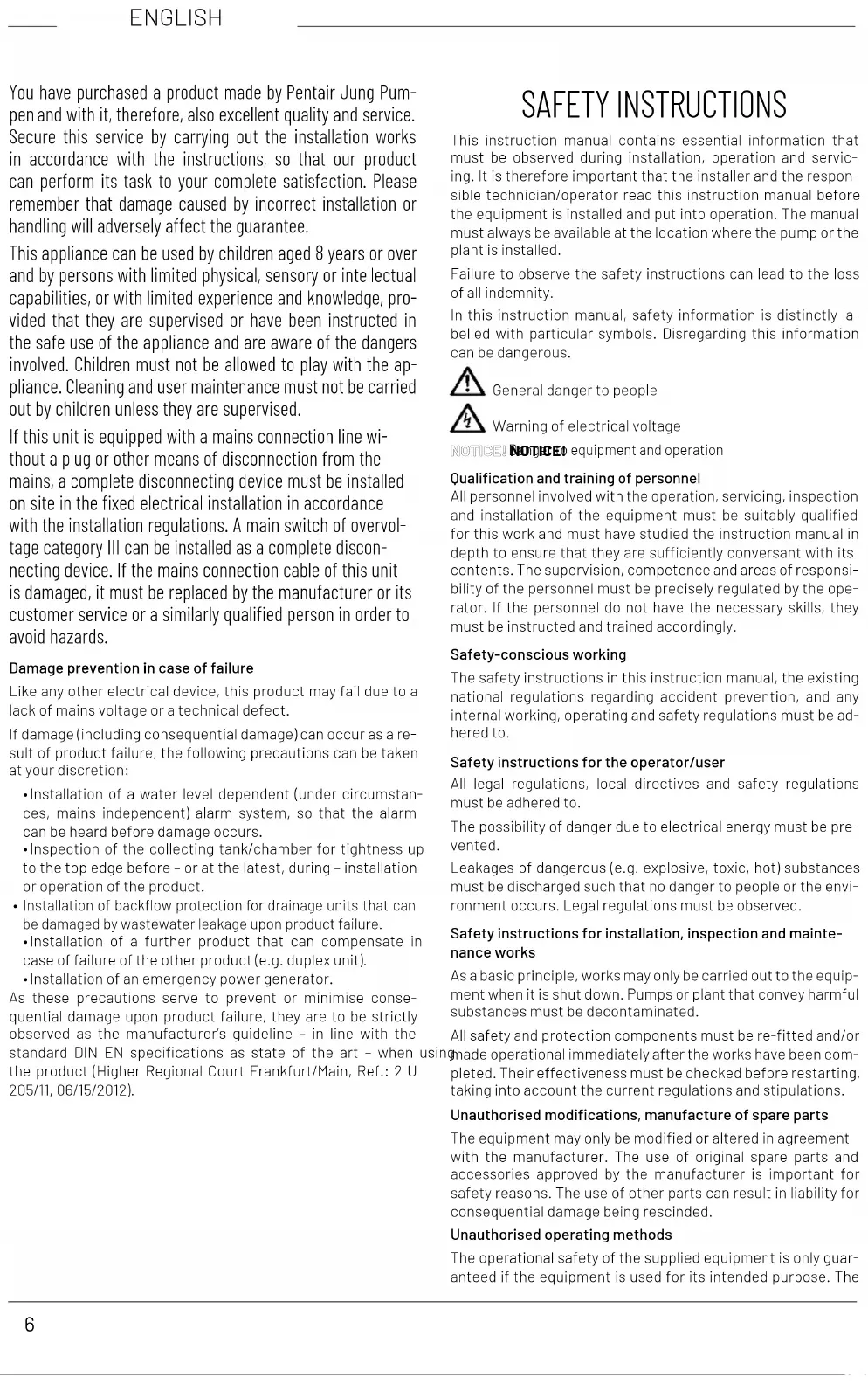 - Falsche Drehrichtung bei Drehstrom = 2 Phasen der Zulei- tung von einer Elek trofachkraft wechseln lassen6 ENGLISH You have purchased a product made by Pentair Jung Pum- pen and with it, therefore, also excellent quality and service. Secure this service by carrying out the installation works in accordance with the instructions, so that our product can perform its task to your complete satisfaction. Please remember that damage caused by incorrect installation or handling will adversely affect the guarantee. This appliance can be used by children aged 8 years or over and by persons with limited physical, sensory or intellectual capabilities, or with limited experience and knowledge, pro- vided that they are supervised or have been instructed in the safe use of the appliance and are aware of the dangers involved. Children must not be allowed to play with the ap- pliance. Cleaning and user maintenance must not be carried out by children unless they are supervised. If this unit is equipped with a mains connection line wi- thout a plug or other means of disconnection from the mains, a complete disconnecting device must be installed on site in the xed electrical installation in accordance with the installation regulations. A main switch of overvol- tage category III can be installed as a complete discon- necting device. If the mains connection cable of this unit is damaged, it must be replaced by the manufacturer or its customer service or a similarly qualied person in order to avoid hazards. Damage prevention in case of failure Like any other electrical device, this product may fail due to a lack of mains voltage or a technical defect. If damage (including consequential damage) can occur as a re- sult of product failure, the following precautions can be taken at your discretion: