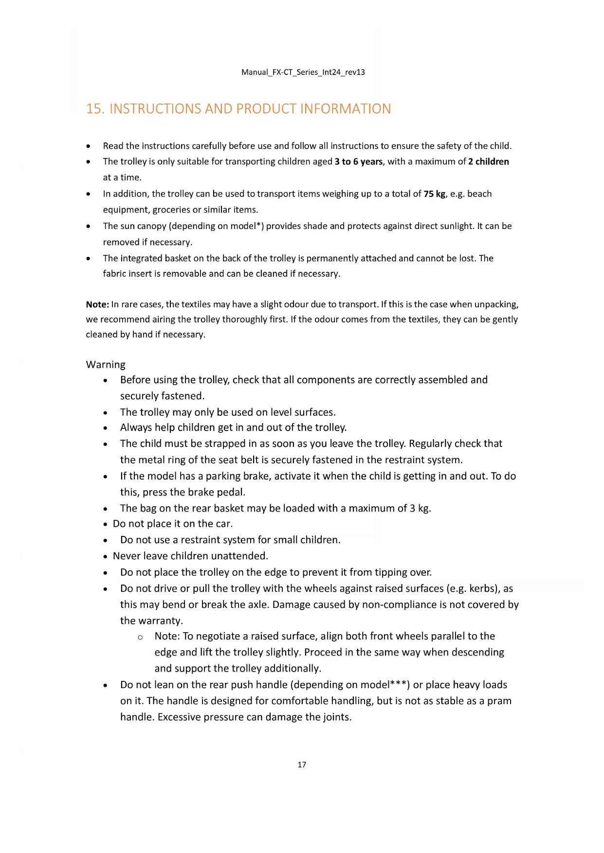 - Before each use, perform a functional check of all moving parts, tyres, brakes (if fitted) and locks.Manual_FX-CT_Series_Int24_rev13