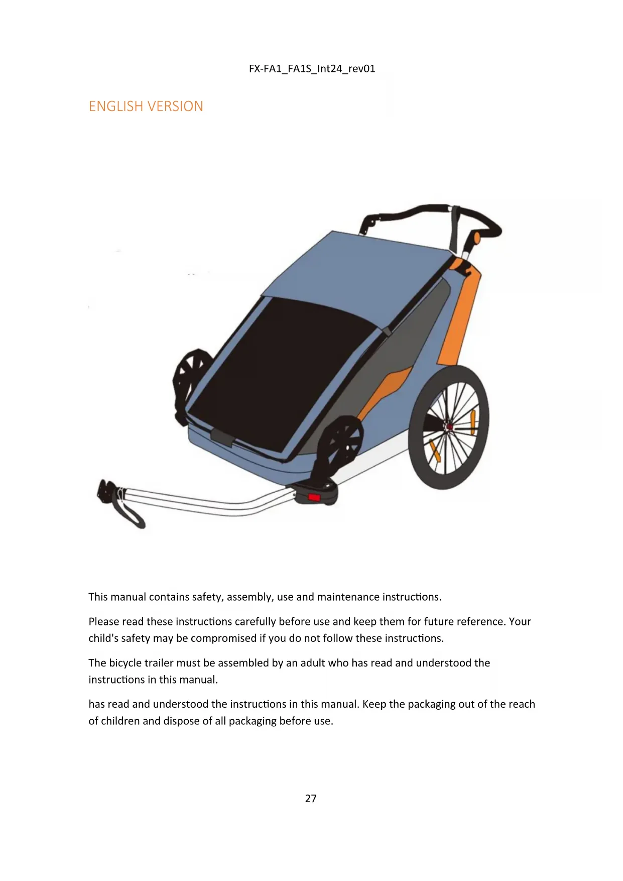 This manual contains safety, assembly, use and maintenance instrucons. Please read these instrucons carefully before use and keep them for future reference. Your child's safety may be compromised if you do not follow these instrucons. The bicycle trailer must be assembled by an adult who has read and understood the instrucons in this manual. has read and understood the instrucons in this manual. Keep the packaging out of the reach of children and dispose of all packaging before use.FX-FA1_FA1S_Int24_rev01