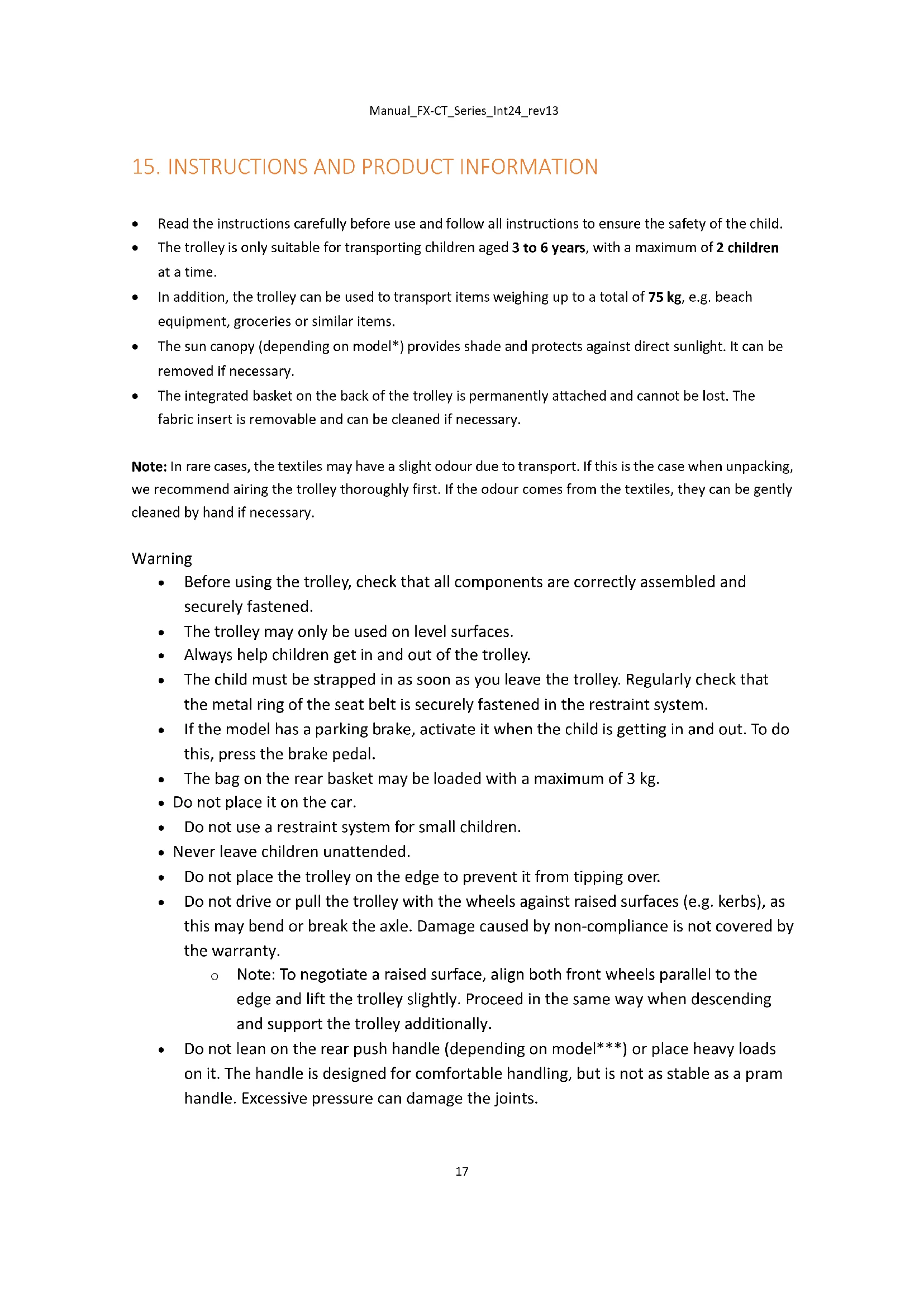 - Before each use, perform a functional check of all moving parts, tyres, brakes (if fitted) and locks.Manual_FX-CT_Series_Int24_rev13
