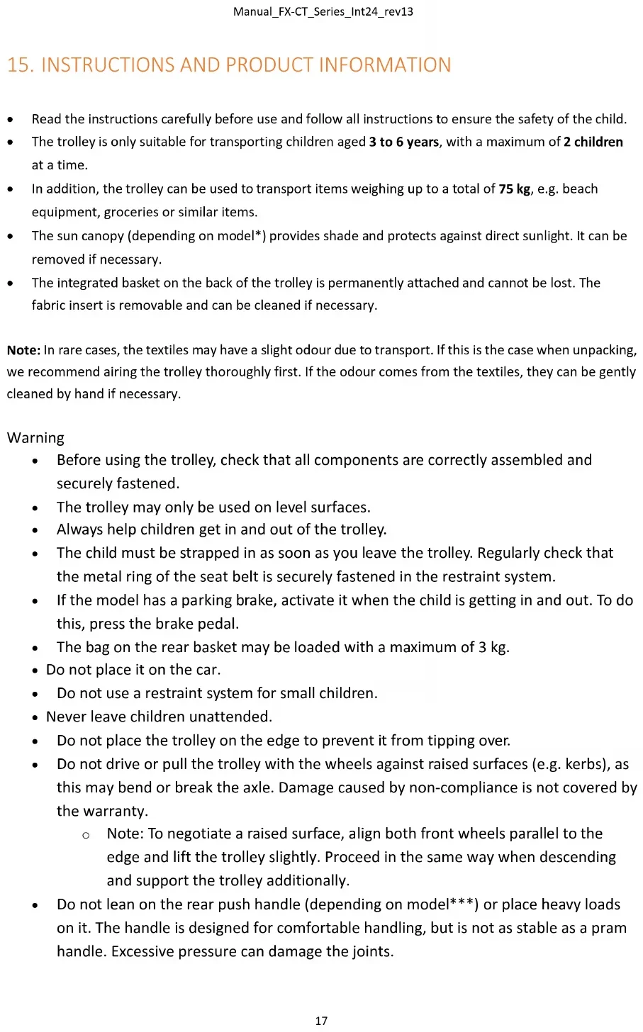 - Before each use, perform a functional check of all moving parts, tyres, brakes (if fitted) and locks.Manual_FX-CT_Series_Int24_rev13