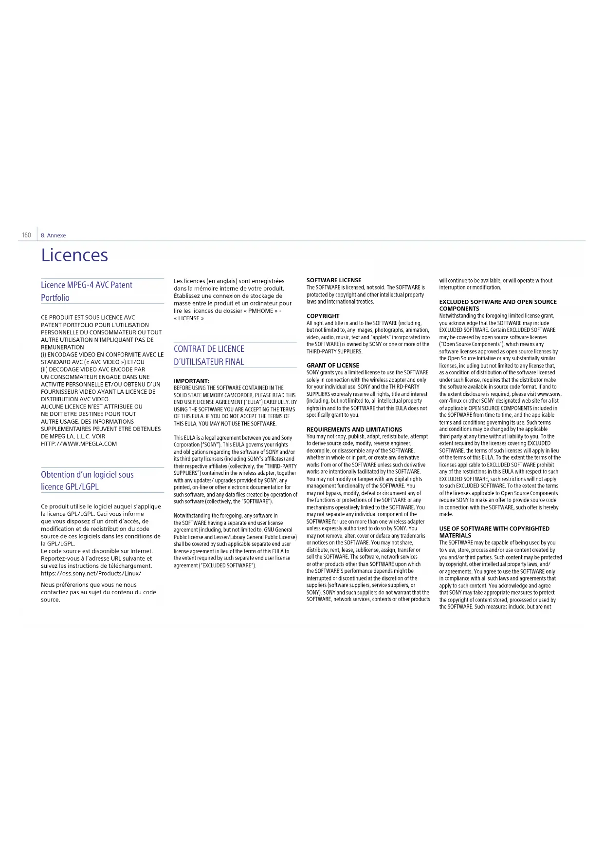 The United Nations Convention on Contracts for the International Sale of Goods shall not apply to this EULA. This EULA shall be governed by the laws of Japan, without regards to conflict of laws provisions. Any dispute arising out of this EULA shall be subject to the exclusive venue of the Tokyo District Court in Japan, and the parties hereby consent to the venue and jurisdiction of such courts. EQUITABLE REMEDIES Notwithstanding anything contained in this EULA to the contrary, you acknowledge and agree that any violation of or noncompliance with this EULA by you will cause irreparable harm to SONY, for which monetary damages would be inadequate, and you consent to SONY obtaining any injunctive or equitable relief that SONY deems necessary or appropriate in such circumstances. SONY may also take any legal and technical remedies to prevent violation of and/or to enforce this EULA, including, but not limited to, immediate termination of your use of the SOFTWARE, if SONY believes in its sole discretion that you are violating or intend to violate this EULA. These remedies are in addition to any other remedies SONY may have at law, in equity or under contract. TERMINATION Without prejudice to any of its other rights, SONY may terminate this EULA if you fail to comply with any of its terms. In case of such termination, you must: (i) cease all use, and destroy any copies, of the SOFTWARE; (ii) comply with the requirements in the section below entitled “Your Account Responsibilities”. AMENDMENT SONY RESERVES THE RIGHT TO AMEND ANY OF THE TERMS OF THIS EULA AT ITS SOLE DISCRETION BY POSTING NOTICE ON A SONY DESIGNATED WEB SITE, BY EMAIL NOTIFICATION TO AN EMAIL ADDRESS PROVIDED BY YOU, BY PROVIDING NOTICE AS PART OF THE PROCESS IN WHICH YOU OBTAIN UPGRADES/ UPDATES OR BY ANY OTHER LEGALLY RECOGNIZABLE FORM OF NOTICE. If you do not agree to the amendment, you should promptly contact SONY for instructions. Your continued use of the SOFTWARE after the effective date of any such notice shall be deemed your agreement to be bound by such amendment. THIRD-PARTY BENEFICIARIES Each THIRD-PARTY SUPPLIER is an express intended thirdparty beneficiary of, and shall have the right to enforce, each provision of this EULA with respect to the SOFTWARE of such party. Should you have any questions concerning this EULA, you may contact SONY by writing to SONY at applicable contact address of each area or country. Copyright © 2012 Sony Corporation. Licences de logiciels libres Sur la base des contrats de licence entre Sony et les détenteurs de copyright des logiciels, ce produit utilise des logiciels libres. Pour répondre aux exigences des détenteurs de copyright des logiciels, Sony est dans l’obligation de vous informer sur le contenu de ces licences. Les licences (en anglais) sont enregistrées dans la mémoire interne de votre produit. Établissez une connexion de stockage de masse entre le produit et un ordinateur pour lire les licences du dossier «PMHOME» - «LICENSE».8. Annexe