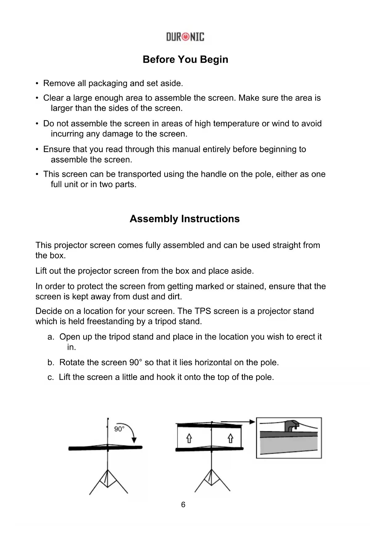 - This screen can be transported using the handle on the pole, either as one full unit or in two parts. This projector screen comes fully assembled and can be used straight from the box. Lift out the projector screen from the box and place aside. In order to protect the screen from getting marked or stained, ensure that the screen is kept away from dust and dirt. Decide on a location for your screen. The TPS screen is a projector stand which is held freestanding by a tripod stand. a. Open up the tripod stand and place in the location you wish to erect it in. b. Rotate the screen 90° so that it lies horizontal on the pole. c. Lift the screen a little and hook it onto the top of the pole. 90°7 Operating Instructions Extending the Screen