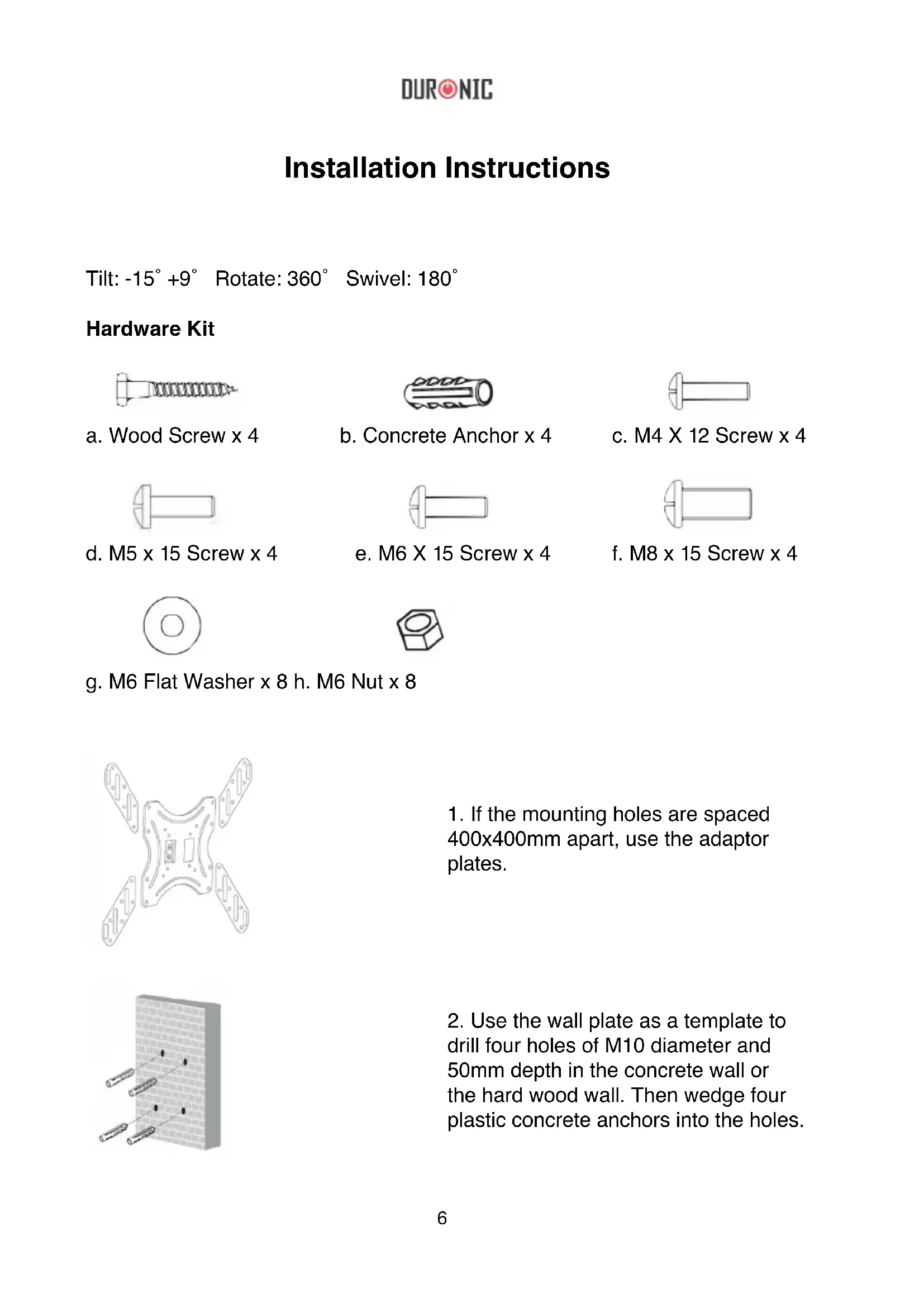 use status to ensure the at panel TV works normally, safely and securely. Please wipe joining parts with a dry cloth frequently. Don’t use it in rain or in moist environment. Please check once two months if all bolts are secure or not.8 Warranty 1 Year Guarantee from Shine-Mart Ltd, Trademark owners of Duronic Products. NOTE: THESE STATEMENTS DO NOT AFFECT YOUR STATUTORY RIGHTS AS A CONSUMER This product has been manufactured under the strictest or quality control procedures, and using the highest quality of materials, to ensure excellent performance and reliability. It will give very good and long lasting service, provided it is properly used and maintained. The product is guaranteed for 1 years from the date of original purchase. If any defect arises due to a faulty materials or poor workmanship, the faulty product must be returned to the original place of purchase. Refund or replacement is at the discretion of that company. Duronic Products are offered with a 1 year guarantee under the following conditions: