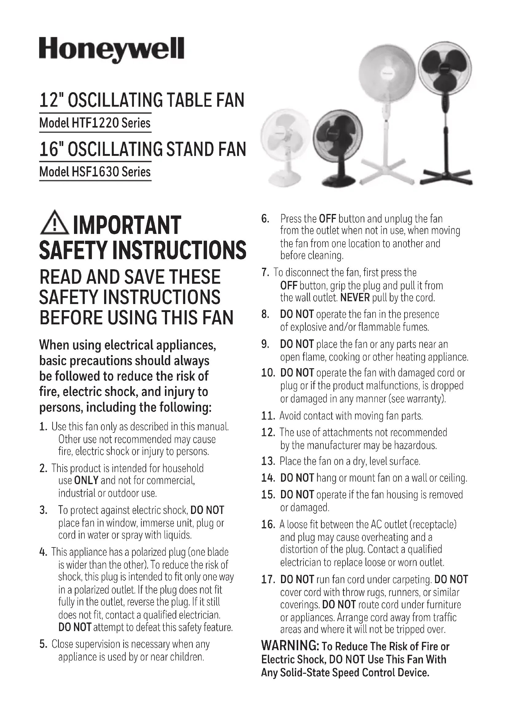 Download the instructions for your Fan in PDF format for free! Find your manual HSF1630B - HONEYWELL and take your electronic device back in hand. On this page are published all the documents necessary for the use of your device. HSF1630B by HONEYWELL.