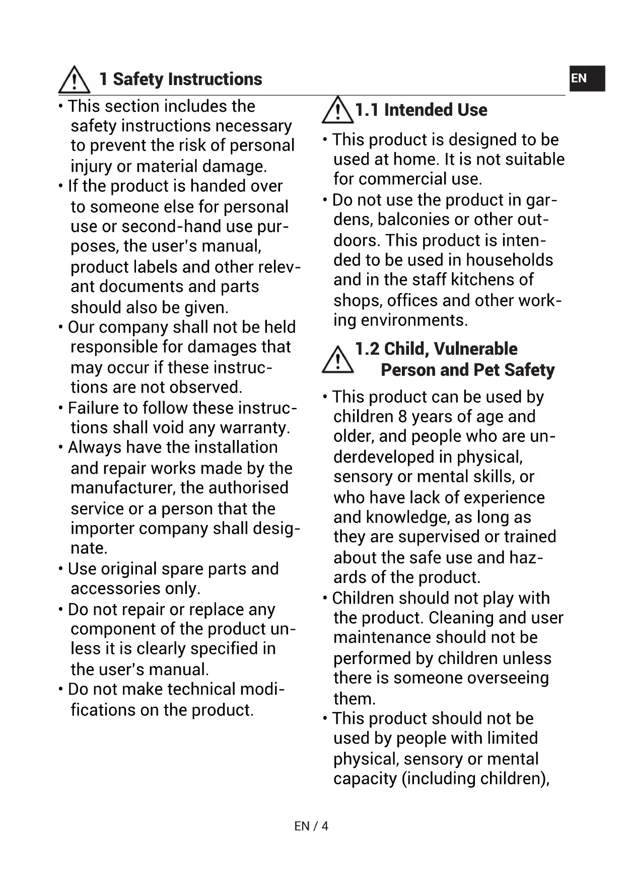 - If the power cable is damaged, it must be replaced by the manufacturer, an authorized service or a person to be spe- cified by the importer com- pany in order to prevent pos- sible dangers.