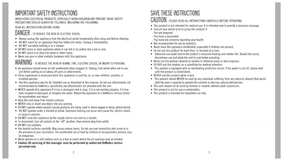 - Caution: All servicing of this massager must be performed by authorized HoMedics service personnel only.