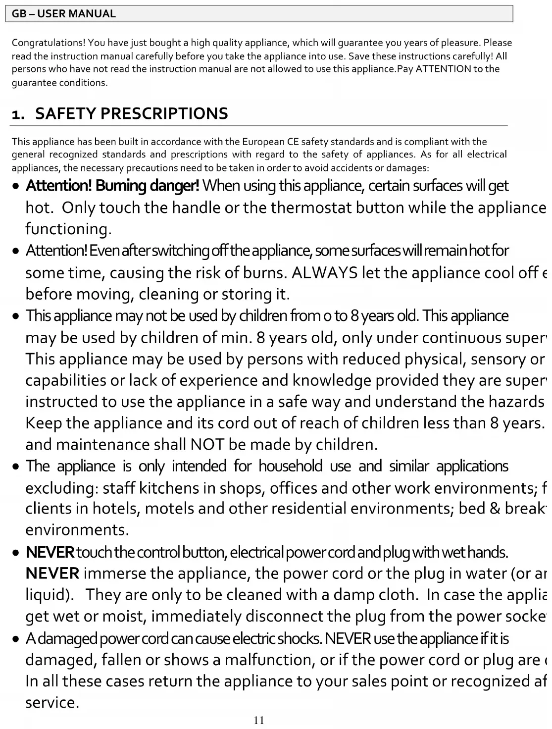 - If the power cord is damaged, don’t use your appliance and return it to your sales point immediately. THE APPLIANCE HAS BEEN DESIGNED FOR DOMESTIC USE. THE GUARANTEE CONDITIONS EXPIRE