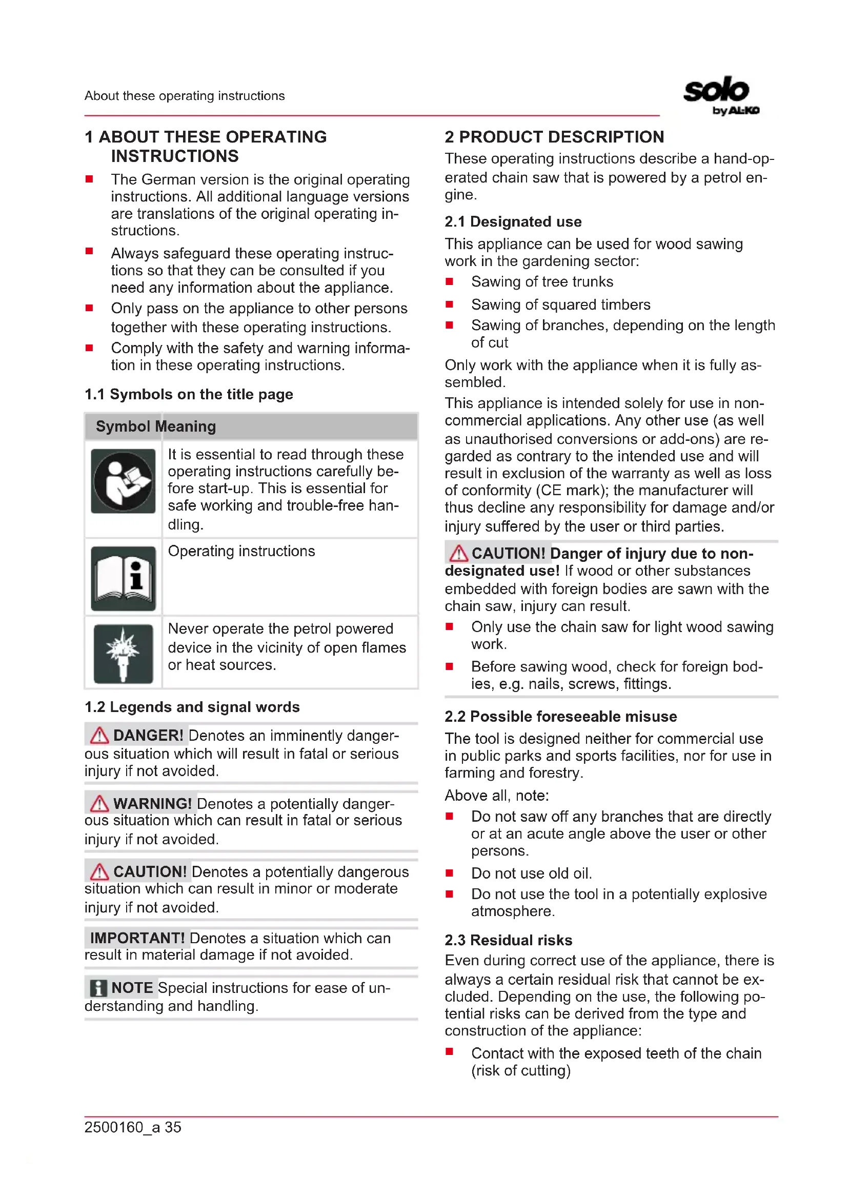 DANGER! Denotes an imminently danger- ous situation which will result in fatal or serious injury if not avoided. WARNING! Denotes a potentially danger- ous situation which can result in fatal or serious injury if not avoided. CAUTION! Denotes a potentially dangerous situation which can result in minor or moderate injury if not avoided. IMPORTANT! Denotes a situation which can result in material damage if not avoided. NOTE Special instructions for ease of un- derstanding and handling. 2 PRODUCT DESCRIPTION These operating instructions describe a hand-op- erated chain saw that is powered by a petrol en- gine.