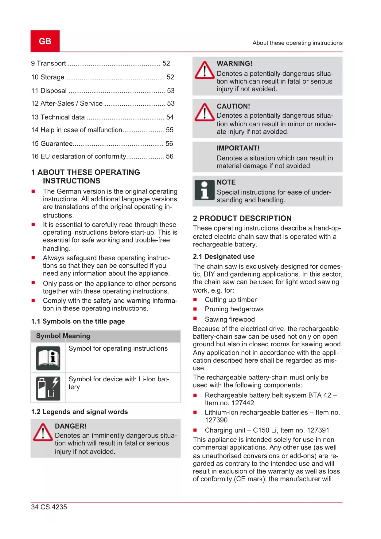 DANGER! Denotes an imminently dangerous situa- tion which will result in fatal or serious injury if not avoided. WARNING! Denotes a potentially dangerous situa- tion which can result in fatal or serious injury if not avoided. CAUTION! Denotes a potentially dangerous situa- tion which can result in minor or moder- ate injury if not avoided. IMPORTANT! Denotes a situation which can result in material damage if not avoided. NOTE Special instructions for ease of under- standing and handling. 2 PRODUCT DESCRIPTION These operating instructions describe a hand-op- erated electric chain saw that is operated with a rechargeable battery.
