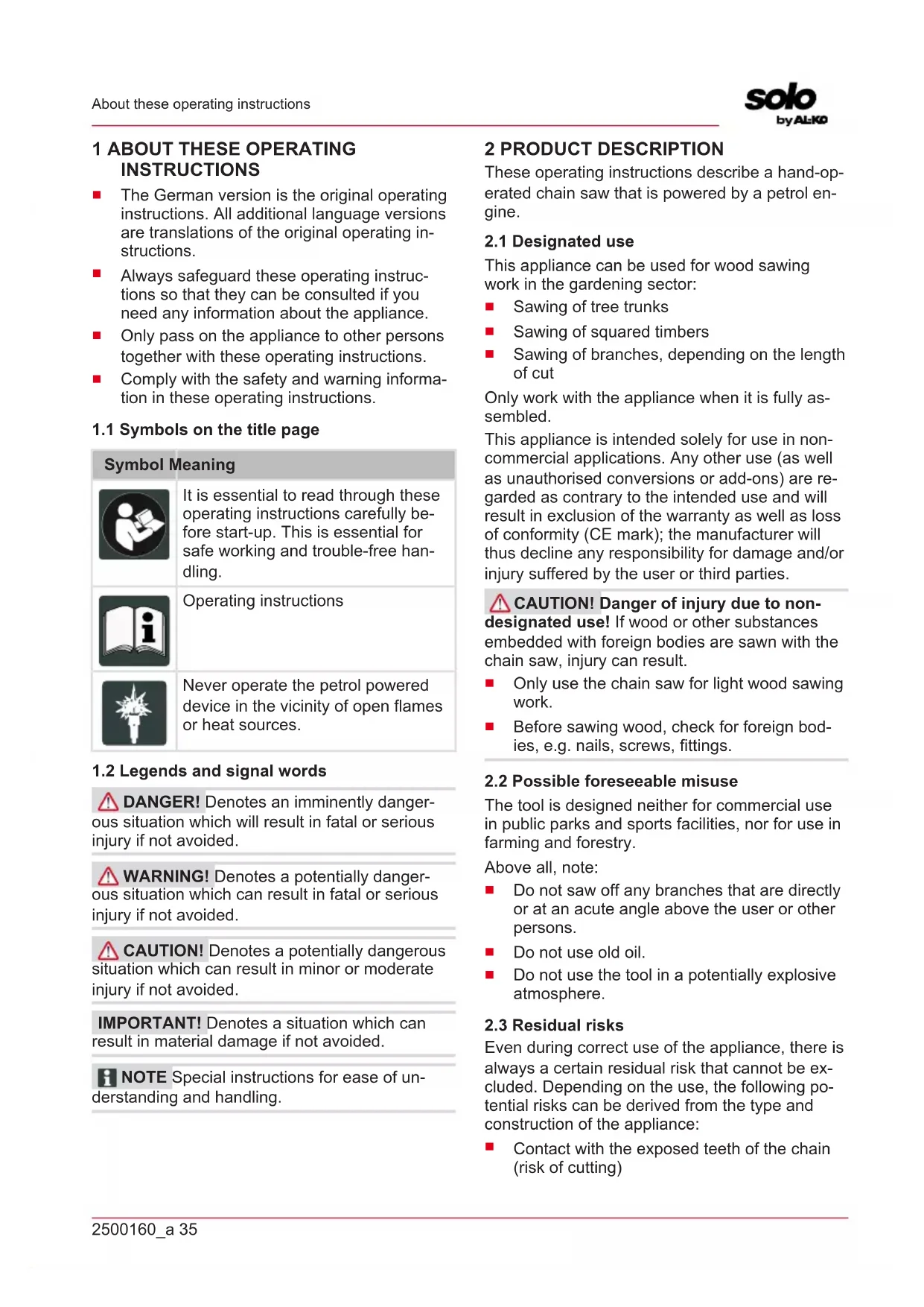 DANGER! Denotes an imminently danger- ous situation which will result in fatal or serious injury if not avoided. WARNING! Denotes a potentially danger- ous situation which can result in fatal or serious injury if not avoided. CAUTION! Denotes a potentially dangerous situation which can result in minor or moderate injury if not avoided. IMPORTANT! Denotes a situation which can result in material damage if not avoided. NOTE Special instructions for ease of un- derstanding and handling. 2 PRODUCT DESCRIPTION These operating instructions describe a hand-op- erated chain saw that is powered by a petrol en- gine.