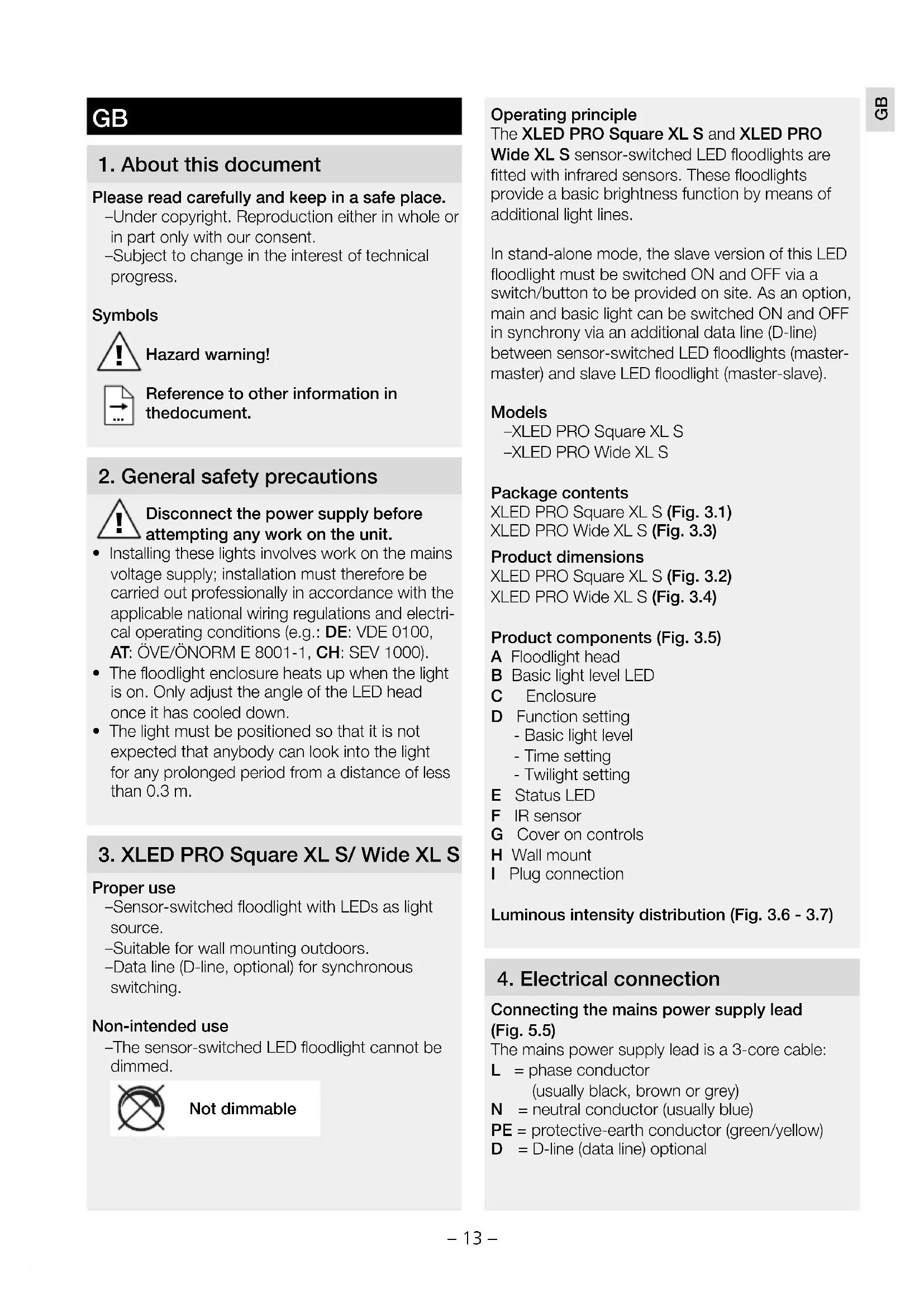 Proper use – Sensor-switched floodlight with LEDs as light source. – Suitable for wall mounting outdoors. – Data line (D-line, optional) for synchronous switching. Non-intended use – The sensor-switched LED floodlight cannot be dimmed. Not dimmable Operating principle The XLEDPROSquareXLS and XLEDPRO WideXLS sensor-switched LED floodlights are fitted with infrared sensors. These floodlights provide a basic brightness function by means of additional light lines. In stand-alone mode, the slave version of this LED floodlight must be switched ON and OFF via a switch/button to be provided on site. As an option, main and basic light can be switched ON and OFF in synchrony via an additional data line (D-line) between sensor-switched LED floodlights (master- master) and slave LED floodlight (master-slave). Models – XLEDPROSquareXLS – XLEDPROWideXLS Package contents XLEDPROSquareXLS (Fig. 3.1) XLEDPROWideXLS (Fig. 3.3) Product dimensions XLEDPROSquareXLS (Fig. 3.2) XLEDPROWideXLS (Fig. 3.4) Product components (Fig. 3.5) A Floodlight head B Basic light level LED C Enclosure D Function setting - Basic light level - Time setting - Twilight setting E Status LED F IR sensor G Cover on controls H Wall mount I Plug connection Luminous intensity distribution (Fig. 3.6 - 3.7)