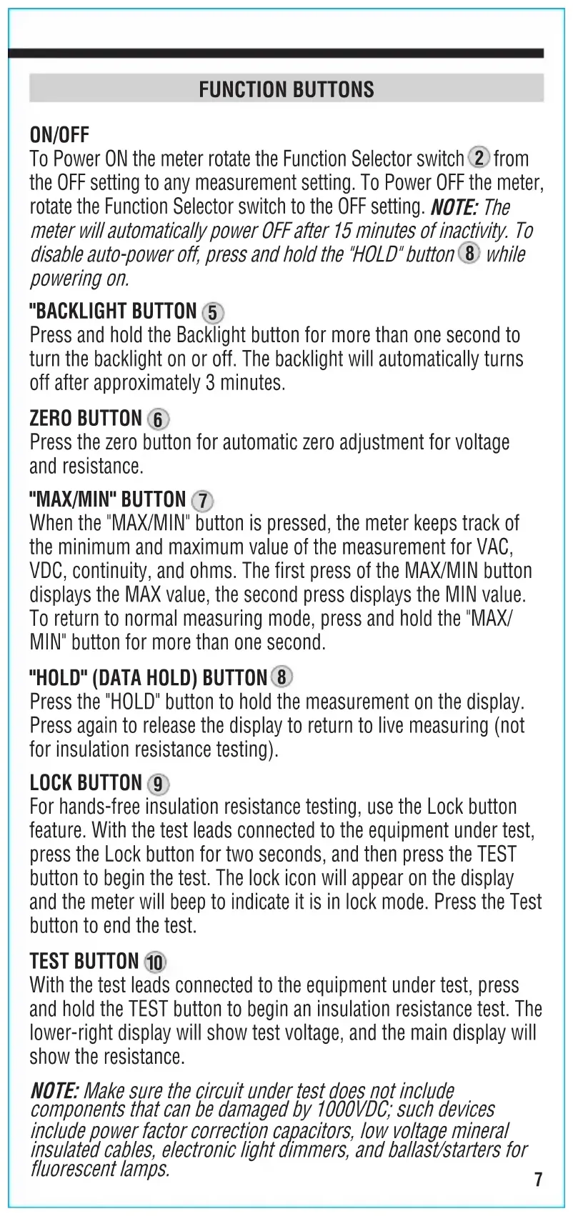 With the test leads connected to the equipment under test, press and hold the TEST button to begin an insulation resistance test. The lower-right display will show test voltage, and the main display will show the resistance. NOTE: Make sure the circuit under test does not include components that can be damaged by 1000VDC; such devices include power factor correction capacitors, low voltage mineral insulated cables, electronic light dimmers, and ballast/starters for fluorescent lamps.8 ENGLISHENGLISH OPERATING INSTRUCTIONS