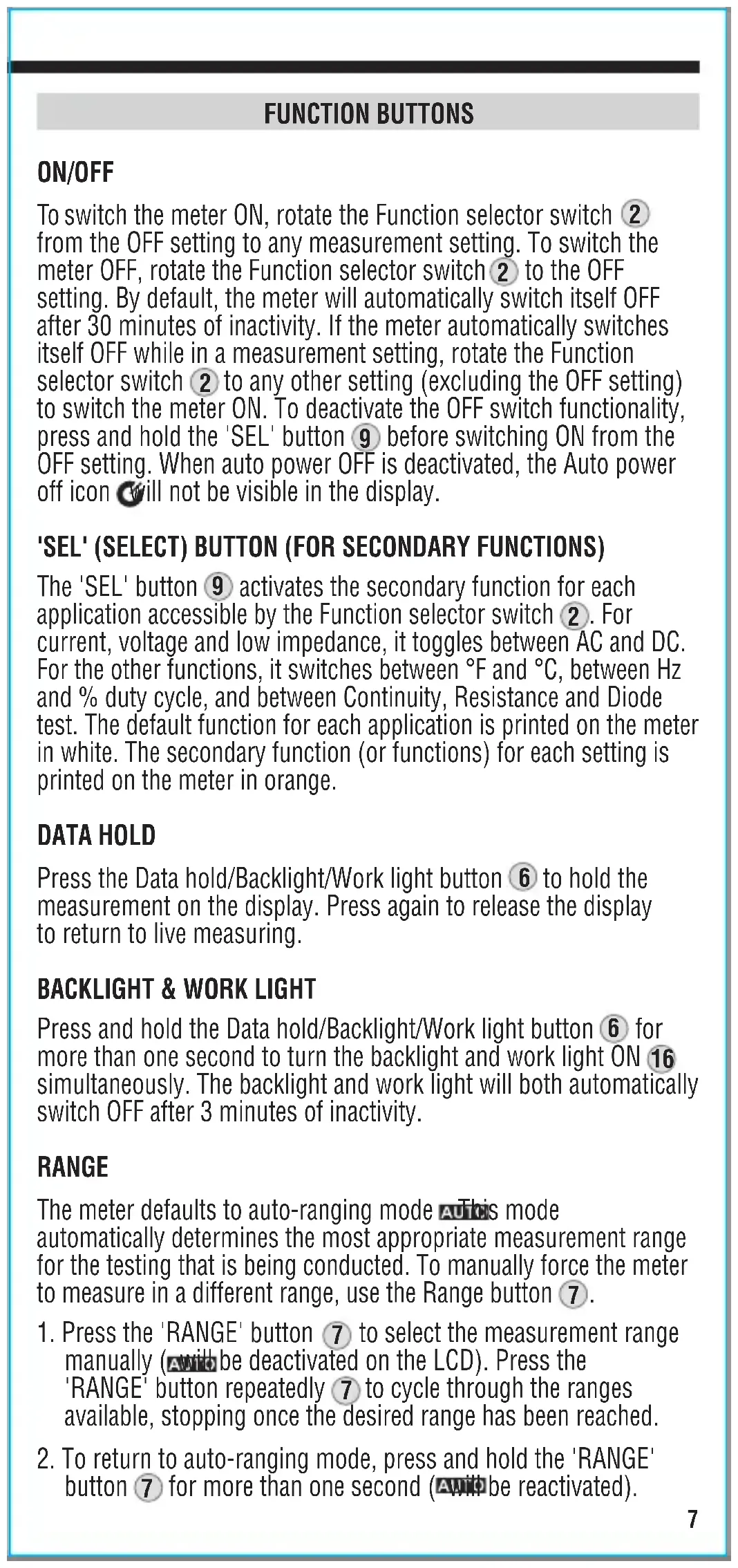 simultaneously. The backlight and work light will both automatically switch OFF after 3 minutes of inactivity. RANGE The meter defaults to auto-ranging mode . This mode automatically determines the most appropriate measurement range for the testing that is being conducted. To manually force the meter to measure in a different range, use the Range button