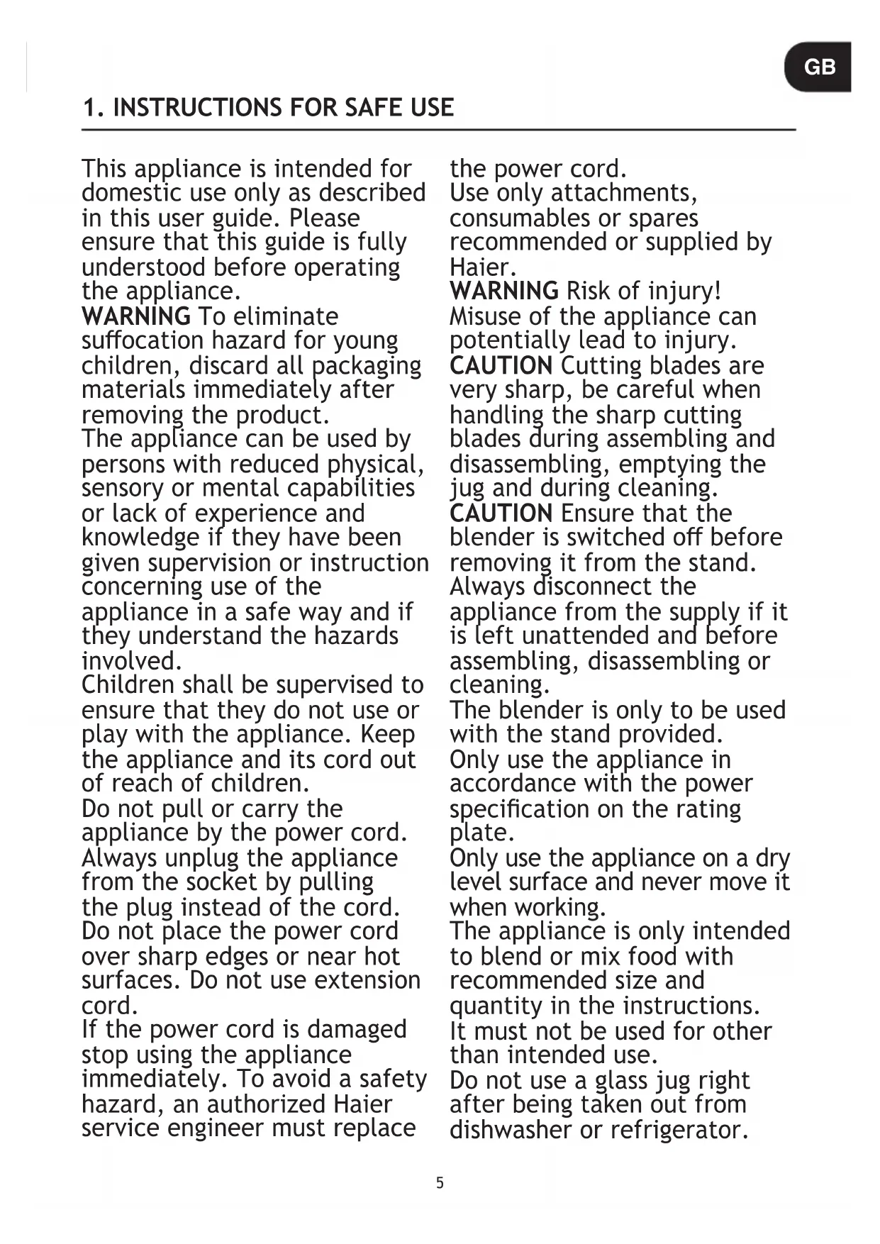 ‘click’ ba5 This appliance is intended for domestic use only as described in this user guide. Please ensure that this guide is fully understood before operating the appliance. WARNING To eliminate suocation hazard for young children, discard all packaging materials immediately after removing the product. The appliance can be used by persons with reduced physical, sensory or mental capabilities or lack of experience and knowledge if they have been given supervision or instruction concerning use of the appliance in a safe way and if they understand the hazards involved. Children shall be supervised to ensure that they do not use or play with the appliance. Keep the appliance and its cord out of reach of children. Do not pull or carry the appliance by the power cord. Always unplug the appliance from the socket by pulling the plug instead of the cord. Do not place the power cord over sharp edges or near hot surfaces. Do not use extension cord. If the power cord is damaged stop using the appliance immediately. To avoid a safety hazard, an authorized Haier service engineer must replace the power cord. Use only attachments, consumables or spares recommended or supplied by Haier. WARNING Risk of injury! Misuse of the appliance can potentially lead to injury. CAUTION Cutting blades are very sharp, be careful when handling the sharp cutting blades during assembling and disassembling, emptying the jug and during cleaning. CAUTION Ensure that the blender is switched o before removing it from the stand. Always disconnect the appliance from the supply if it is left unattended and before assembling, disassembling or cleaning. The blender is only to be used with the stand provided. Only use the appliance in accordance with the power specication on the rating plate. Only use the appliance on a dry level surface and never move it when working. The appliance is only intended to blend or mix food with recommended size and quantity in the instructions. It must not be used for other than intended use. Do not use a glass jug right after being taken out from dishwasher or refrigerator.