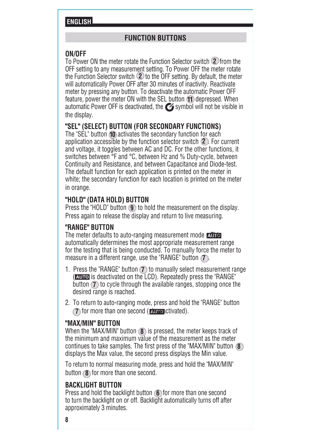 "SEL" (Select) button NOTE: There are no user-serviceable parts inside meter.8 FUNCTION BUTTONS ON/OFF To Power ON the meter rotate the Function Selector switch