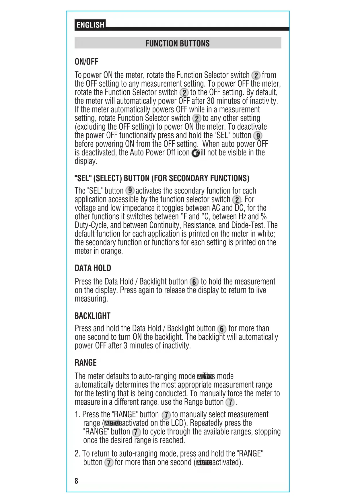 for more than one second to turn ON the backlight. The backlight will automatically power OFF after 3 minutes of inactivity. RANGE The meter defaults to auto-ranging mode . This mode automatically determines the most appropriate measurement range for the testing that is being conducted. To manually force the meter to measure in a different range, use the Range button
