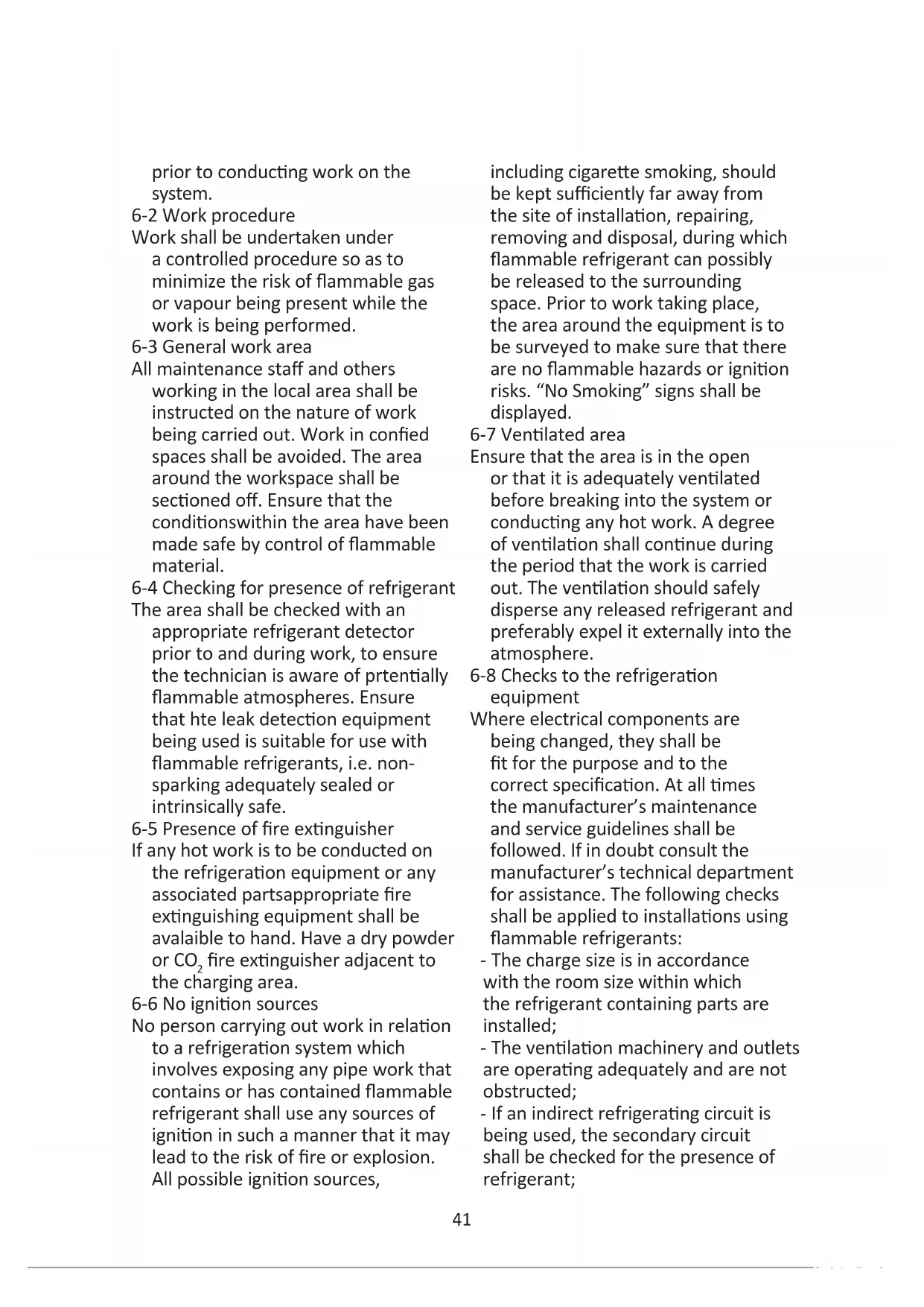 6-1 Checks to the area Prior to beginning work on system containing ammable refrigerants, safety checks are necessary to ensure that the risk of ignion is minimized. For repair to the refrigerang system the following precauons shall be complied with41 prior to conducng work on the system. 6-2 Work procedure Work shall be undertaken under a controlled procedure so as to minimize the risk of ammable gas or vapour being present while the work is being performed. 6-3 General work area All maintenance sta and others working in the local area shall be instructed on the nature of work being carried out. Work in coned spaces shall be avoided. The area around the workspace shall be seconed o. Ensure that the condionswithin the area have been made safe by control of ammable material. 6-4 Checking for presence of refrigerant The area shall be checked with an appropriate refrigerant detector prior to and during work, to ensure the technician is aware of prtenally ammable atmospheres. Ensure that hte leak detecon equipment being used is suitable for use with ammable refrigerants, i.e. non- sparking adequately sealed or intrinsically safe. 6-5 Presence of re exnguisher If any hot work is to be conducted on the refrigeraon equipment or any associated partsappropriate re exnguishing equipment shall be avalaible to hand. Have a dry powder or CO