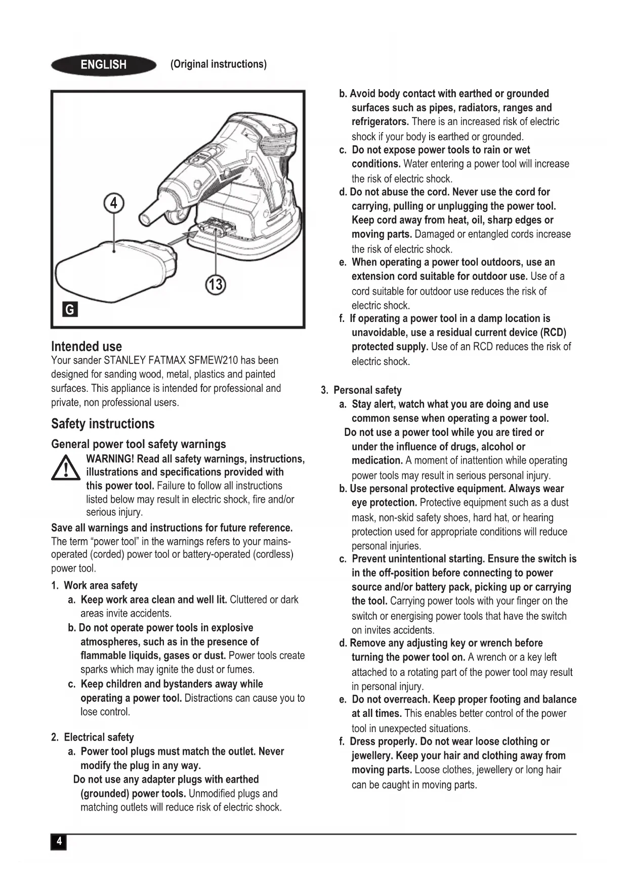 Intended use Your sander STANLEY FATMAX SFMEW210 has been designed for sanding wood, metal, plastics and painted surfaces. This appliance is intended for professional and private, non professional users. Safety instructions General power tool safety warnings