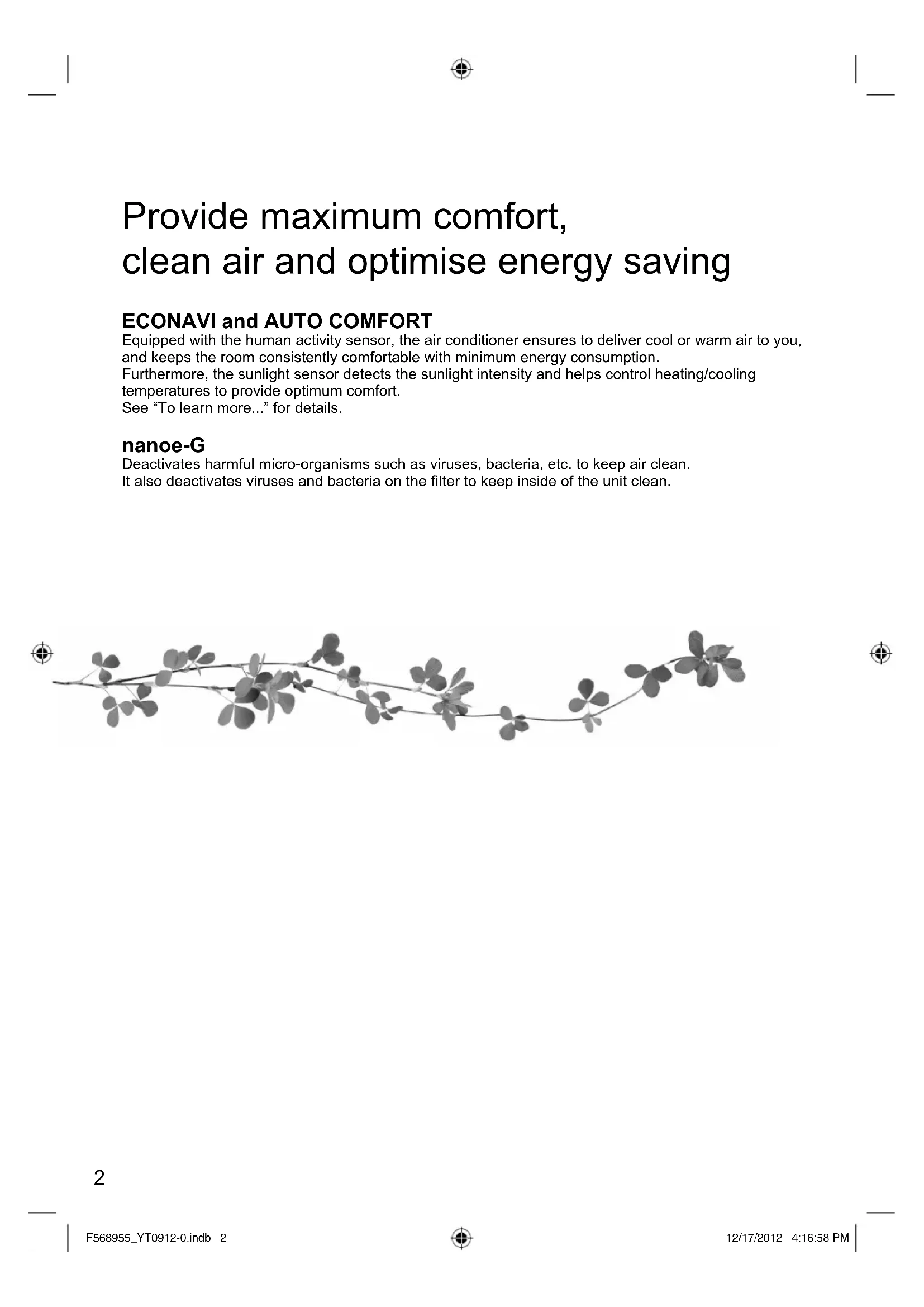 New batteries of the same type must be inserted following the polarity stated. Power supply Do not disconnect the plug by pulling the cord to prevent electric shock. Safety precautions F568955_YT0912-0.indb 5F568955_YT0912-0.indb 5 12/17/2012 4:17:02 PM12/17/2012 4:17:02 PM6 Human activity sensor and indicator Sunlight sensor and remote control receiver AUTO COMFORT MODE POWERFUL/QUIETTEMPOFF/ONTIMERSETCANCELONOFF123AIR SWINGFAN SPEEDSET CLOCK FAN SPEED AIR SWING AUTO HEAT COOL DRY ECONAVINANOE-GRESET