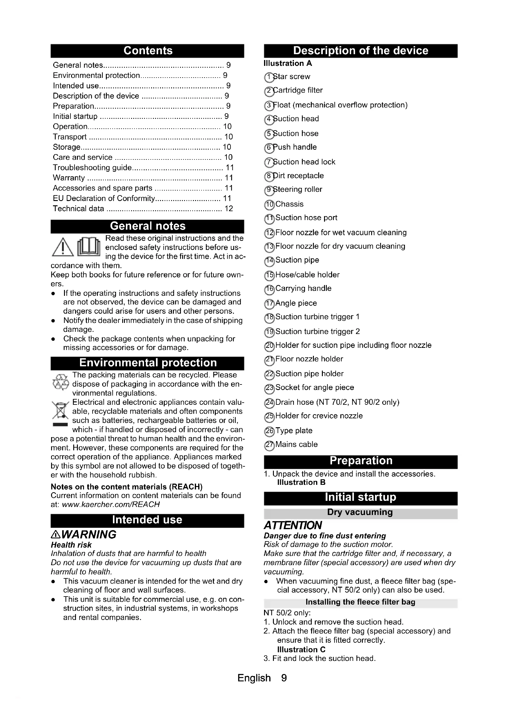 H05VV-F 2x1,0 H05VV-F 2x1,0 H05VV-F 2x1,0 Teilenummer (EU) 9.770-933.0 9.770-933.0 9.770-933.0 Kabellänge m 7,5 7,5 7,5English 9 Contents General notes Read these original instructions and the enclosed safety instructions before us- ing the device for the first time. Act in ac- cordance with them. Keep both books for future reference or for future own- ers. ● If the operating instructions and safety instructions are not observed, the device can be damaged and dangers could arise for users and other persons. ● Notify the dealer immediately in the case of shipping damage. ● Check the package contents when unpacking for missing accessories or for damage. Environmental protection The packing materials can be recycled. Please dispose of packaging in accordance with the en- vironmental regulations. Electrical and electronic appliances contain valu- able, recyclable materials and often components such as batteries, rechargeable batteries or oil, which - if handled or disposed of incorrectly - can pose a potential threat to human health and the environ- ment. However, these components are required for the correct operation of the appliance. Appliances marked by this symbol are not allowed to be disposed of togeth- er with the household rubbish. Notes on the content materials (REACH) Current information on content materials can be found at: www.kaercher.com/REACH Intended use 몇 WARNING Health risk Inhalation of dusts that are harmful to health Do not use the device for vacuuming up dusts that are harmful to health. ● This vacuum cleaner is intended for the wet and dry cleaning of floor and wall surfaces. ● This unit is suitable for commercial use, e.g. on con- struction sites, in industrial systems, in workshops and rental companies. Description of the device Illustration A 1 Star screw 2 Cartridge filter 3 Float (mechanical overflow protection) 4 Suction head 5 Suction hose 6 Push handle 7 Suction head lock 8 Dirt receptacle 9 Steering roller 10 Chassis 11 Suction hose port 12 Floor nozzle for wet vacuum cleaning 13 Floor nozzle for dry vacuum cleaning 14 Suction pipe 15 Hose/cable holder 16 Carrying handle 17 Angle piece 18 Suction turbine trigger 1 19 Suction turbine trigger 2 20 Holder for suction pipe including floor nozzle 21 Floor nozzle holder 22 Suction pipe holder 23 Socket for angle piece 24 Drain hose (NT 70/2, NT 90/2 only) 25 Holder for crevice nozzle 26 Type plate 27 Mains cable Preparation