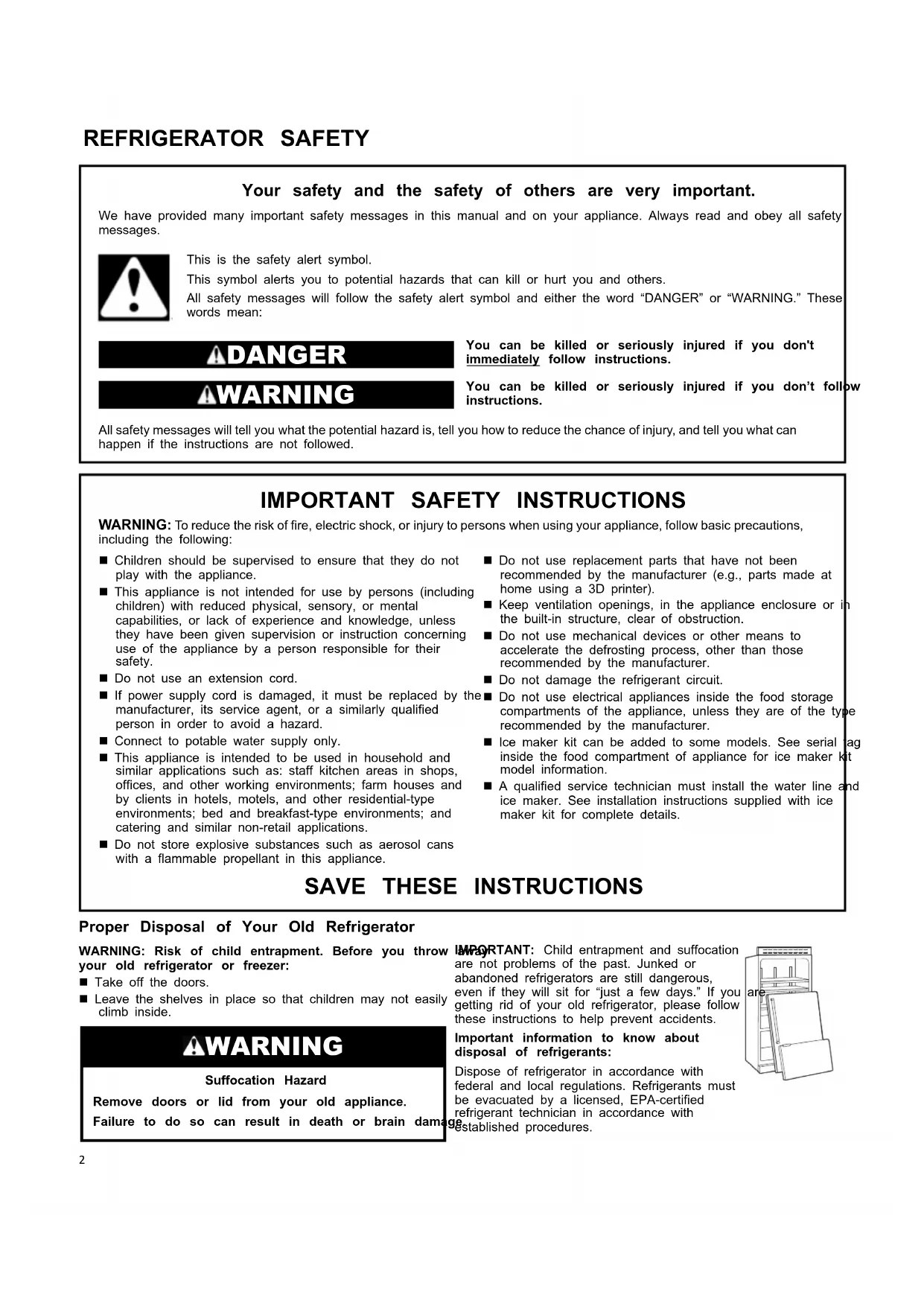 Utilisation du réfrigérateur.............................................. 46 Distributeurs d’eau et de glaçons..................................... 46 Machine à glaçons ....................................................... 472 REFRIGERATOR SAFETY Your safety and the safety of others are very important. We have provided many important safety messages in this manual and on your appliance. Always read and obey all safetymessages.This is the safety alert symbol.This symbol alerts you to potential hazards that can kill or hurt you and others.All safety messages will follow the safety alert symbol and either the word “DANGER” or “WARNING.” Thesewords mean: DANGER You can be killed or seriously injured if you don'timmediately follow instructions. WARNING You can be killed or seriously injured if you don’t followinstructions. All safety messages will tell you what the potential hazard is, tell you how to reduce the chance of injury, and tell you what can happen if the instructions are not followed.