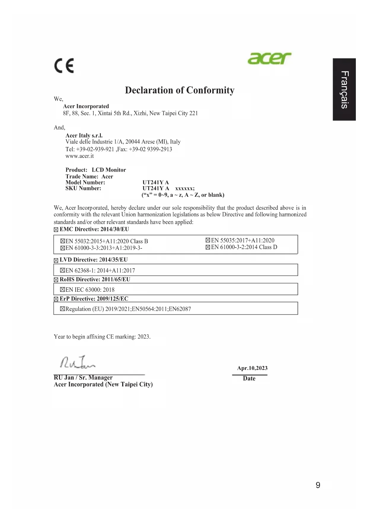 Federal Communications Commission Supplier's Declaration of Conformity This device complies with Part 15 of the FCC Rules. Operation is subject to the following two conditions: (1) this device may not cause harmful interference, and (2) this device must accept any interference received, including interference that may cause undesired operation. The following local Manufacturer /Importer is responsible for this declaration: Product: LCD Monitor Model Number: UT241Y A SKU Number: UT241Y A xxxxxx (“x” = 0~9, a ~ z, A ~ Z, or blank) Name of Responsible Party: Acer America Corporation Address of Responsible Party: 333 West San Carlos St. Suite 1500 San Jose, CA 95110 U. S. A. Contact Person: Acer Representative Phone No.: 254-298-4000 Fax No.: 254-298-4147 Acer America Corporation 333 West San Carlos St., San Jose Suite 1500 CA 95110, U. S. A. Tel : 254-298-4000 Fax : 254-298-4147 www.acer.comFrançais