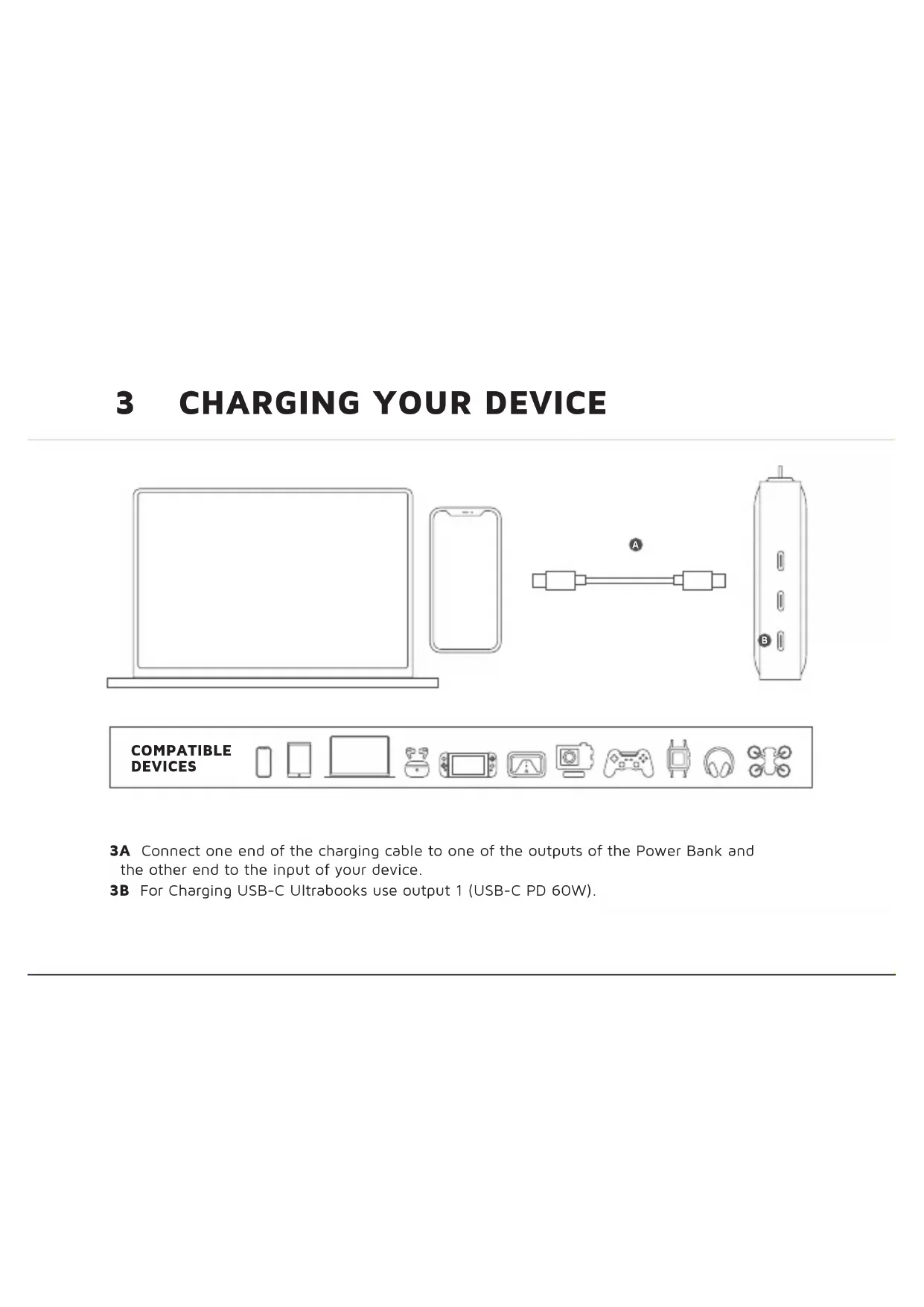 3A Connect one end of the charging cable to one of the outputs of the Power Bank and the other end to the input of your device. 3B For Charging USB-C Ultrabooks use output 1 (USB-C PD 60W).