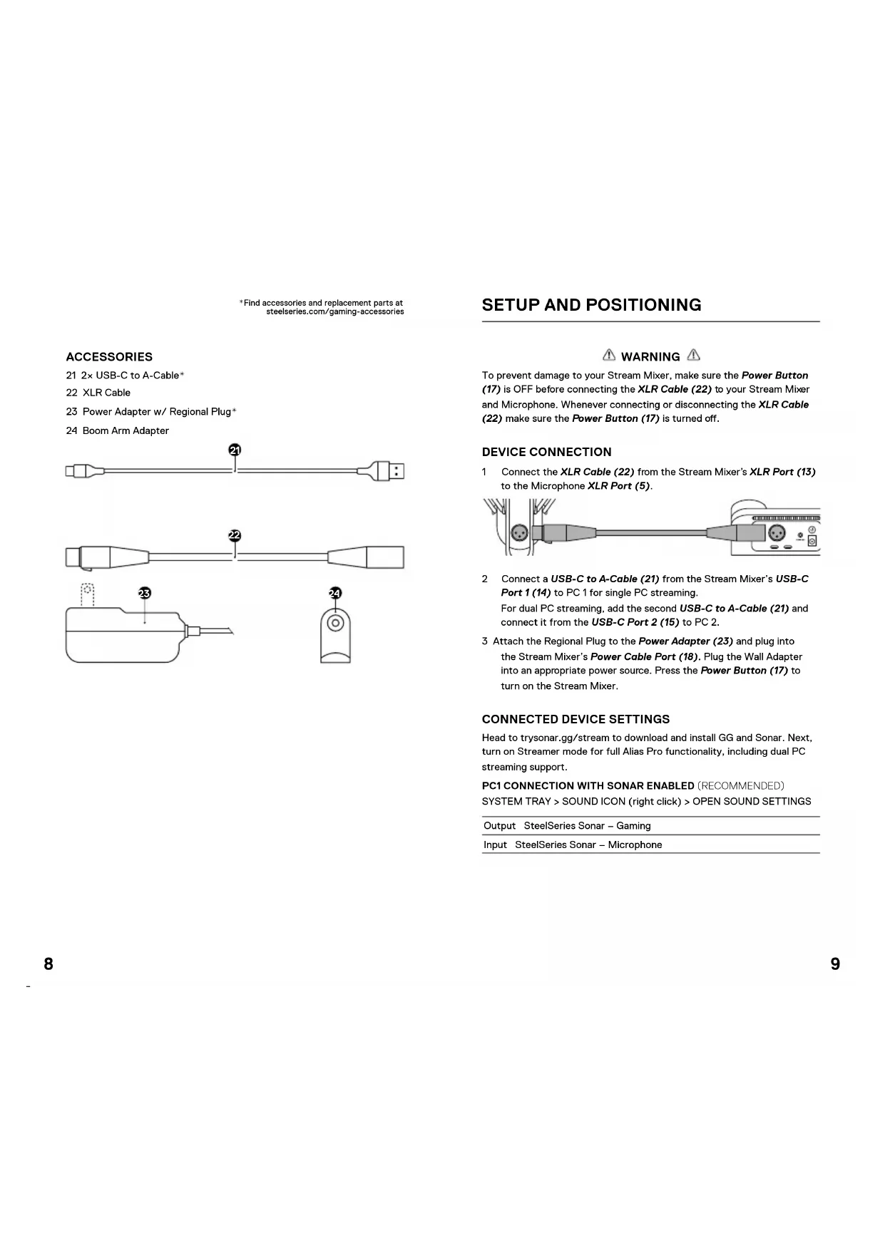 WARNING To prevent damage to your Stream Mixer, make sure the Power Button (17) is OFF before connecting the XLR Cable (22) to your Stream Mixer and Microphone. Whenever connecting or disconnecting the XLR Cable (22) make sure the Power Button (17) is turned o. DEVICE CONNECTION 1 Connect the XLR Cable (22) from the Stream Mixer’s XLR Port (13) to the Microphone XLR Port (5). 2 Connect a USB-C to A-Cable (21) from the Stream Mixer’s USB-C Port 1 (14) to PC 1 for single PC streaming. For dual PC streaming, add the second USB-C to A-Cable (21) and connect it from the USB-C Port 2 (15) to PC 2. 3 Attach the Regional Plug to the Power Adapter (23) and plug into the Stream Mixer’s Power Cable Port (18). Plug the Wall Adapter into an appropriate power source. Press the Power Button (17) to turn on the Stream Mixer.
