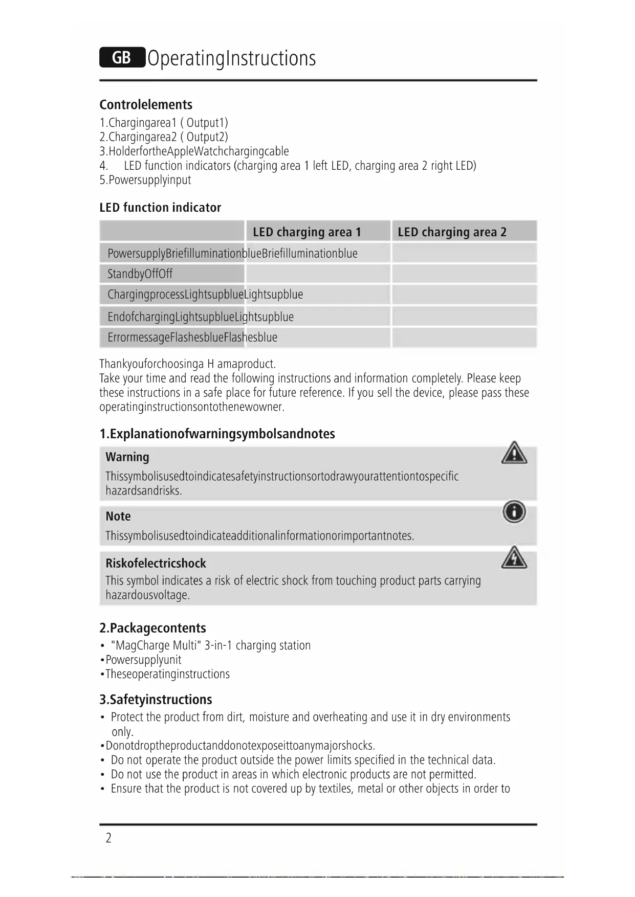 LED functionindicator LED chargingarea 1LED chargingarea2 Power supply Brief illumination blue Brief illumination blue Standby Off Off Charging process Lights up blue Lights up blue End of charging Lights up blue Lights up blue Error message Flashes blue Flashes blue Thank you for choosing aHama product. Take your time and read the following instructions and information completely.Please keep these instructions in asafe place for futurereference. If you sell the device, please pass these operating instructions on to the new owner.
