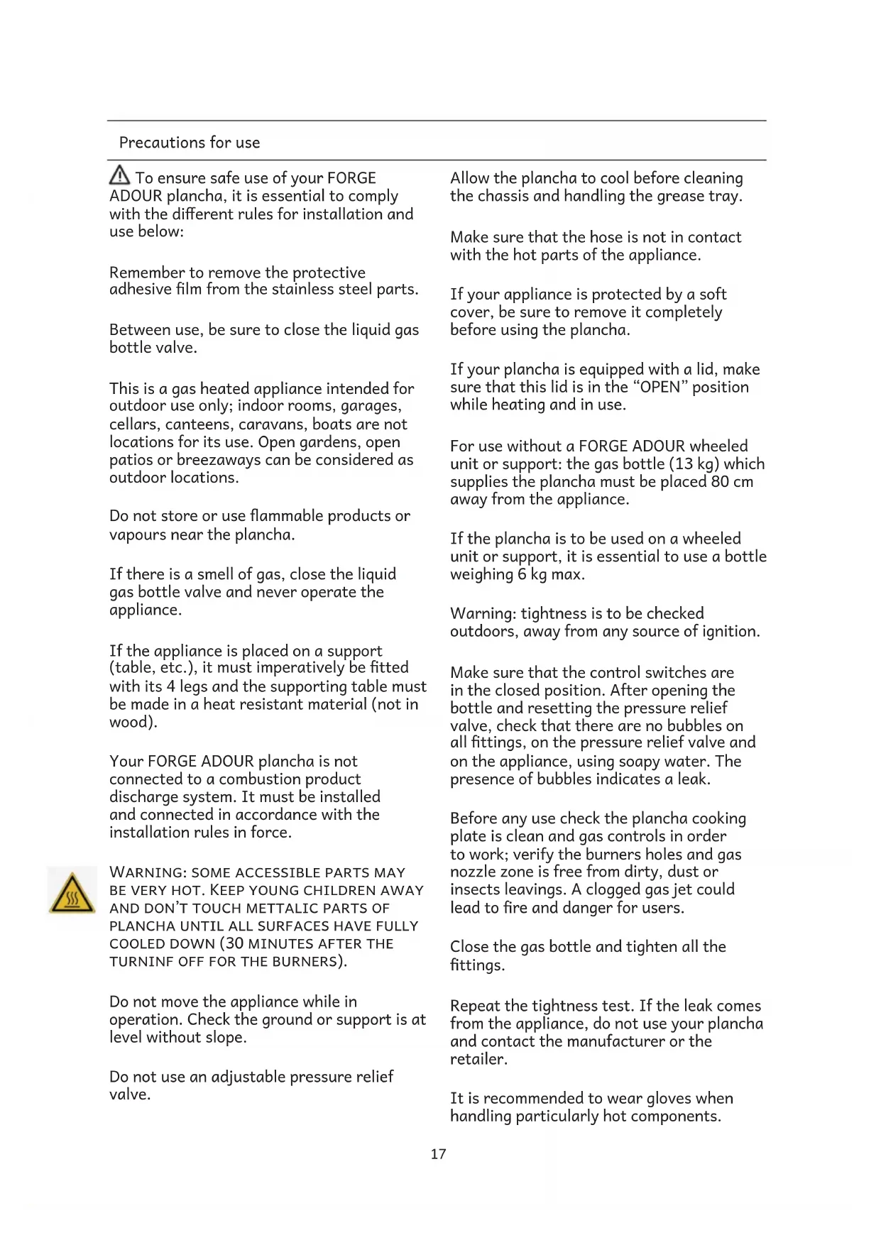 Do not move the appliance while in operation. Check the ground or support is at level without slope. Do not use an adjustable pressure relief valve. Allow the plancha to cool before cleaning the chassis and handling the grease tray. Make sure that the hose is not in contact with the hot parts of the appliance. If your appliance is protected by a soft cover, be sure to remove it completely before using the plancha. If your plancha is equipped with a lid, make sure that this lid is in the “OPEN” position while heating and in use. For use without a FORGE ADOUR wheeled unit or support: the gas bottle (13 kg) which supplies the plancha must be placed 80 cm away from the appliance. If the plancha is to be used on a wheeled unit or support, it is essential to use a bottle weighing 6 kg max.