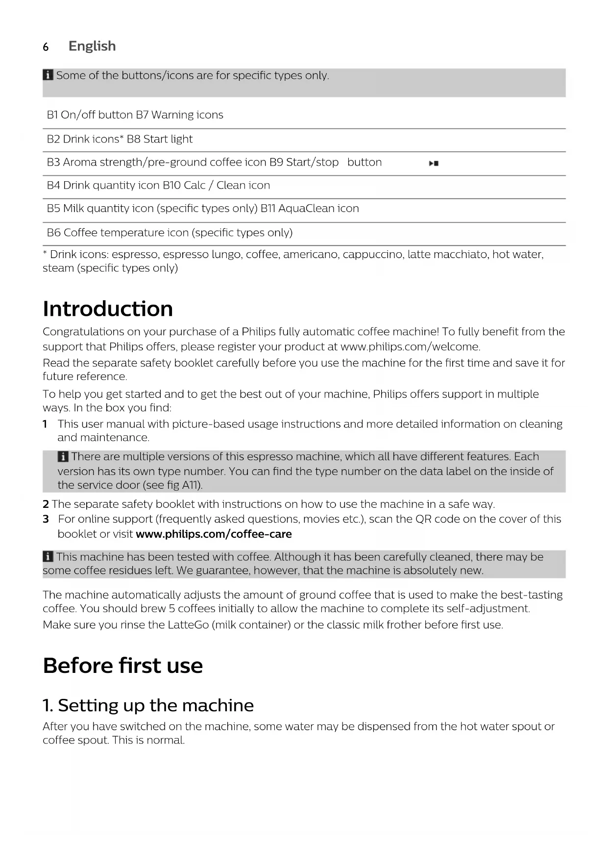 - Drink icons: espresso, espresso lungo, coffee, americano, cappuccino, latte macchiato, hot water, steam (specific types only) Introduction Congratulations on your purchase of a Philips fully automatic coffee machine! To fully benefit from the support that Philips offers, please register your product at www.philips.com/welcome. Read the separate safety booklet carefully before you use the machine for the first time and save it for future reference. To help you get started and to get the best out of your machine, Philips offers support in multiple ways. In the box you find: 1 This user manual with picture-based usage instructions and more detailed information on cleaning and maintenance. There are multiple versions of this espresso machine, which all have different features. Each version has its own type number. You can find the type number on the data label on the inside of the service door (see fig A11). 2 The separate safety booklet with instructions on how to use the machine in a safe way. 3 For online support (frequently asked questions, movies etc.), scan the QR code on the cover of this booklet or visit www.philips.com/coffee-care This machine has been tested with coffee. Although it has been carefully cleaned, there may be some coffee residues left. We guarantee, however, that the machine is absolutely new. The machine automatically adjusts the amount of ground coffee that is used to make the best-tasting coffee. You should brew 5 coffees initially to allow the machine to complete its self-adjustment. Make sure you rinse the LatteGo (milk container) or the classic milk frother before first use. Before first use