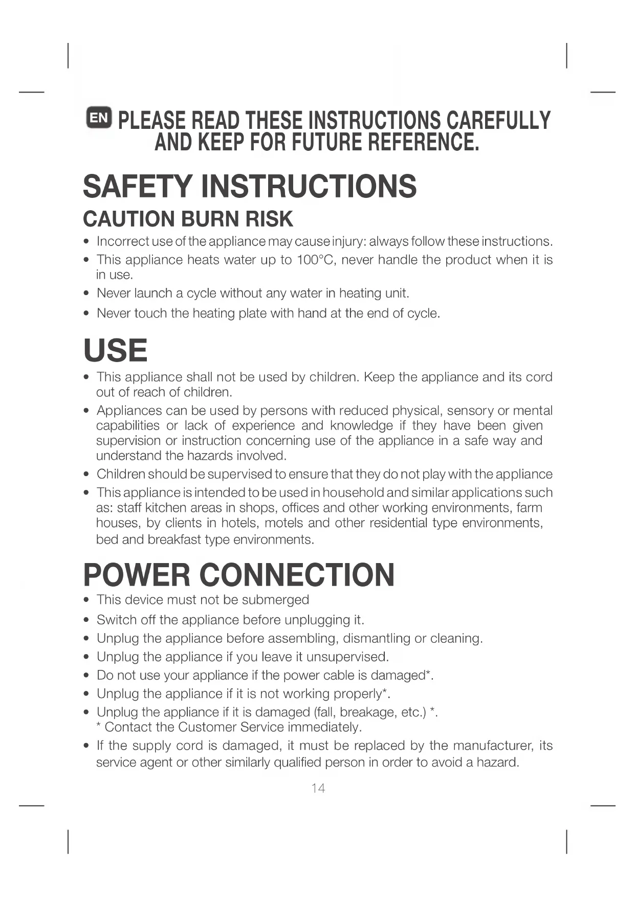 - This appliance heats water up to 100°C, never handle the product when it is in use.