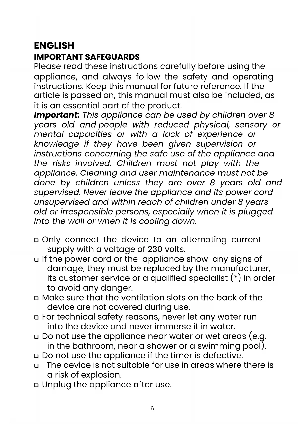 ENGLISH IMPORTANT SAFEGUARDS Please read these instructions carefully before using the appliance, and always follow the safety and operating instructions. Keep this manual for future reference. If the article is passed on, this manual must also be included, as it is an essential part of the product. Important: This appliance can be used by children over 8 years old and people with reduced physical, sensory or mental capacities or with a lack of experience or knowledge if they have been given supervision or instructions concerning the safe use of the appliance and the risks involved. Children must not play with the appliance. Cleaning and user maintenance must not be done by children unless they are over 8 years old and supervised. Never leave the appliance and its power cord unsupervised and within reach of children under 8 years old or irresponsible persons, especially when it is plugged into the wall or when it is cooling down. ❑ Only connect the device to an alternating current supply with a voltage of 230 volts. ❑ If the power cord or the appliance show any signs of damage, they must be replaced by the manufacturer, its customer service or a qualified specialist (*) in order to avoid any danger. ❑ Make sure that the ventilation slots on the back of the device are not covered during use. ❑ For technical safety reasons, never let any water run into the device and never immerse it in water. ❑ Do not use the appliance near water or wet areas (e.g. in the bathroom, near a shower or a swimming pool). ❑ Do not use the appliance if the timer is defective. ❑ The device is not suitable for use in areas where there is a risk of explosion. ❑ Unplug the appliance after use.7