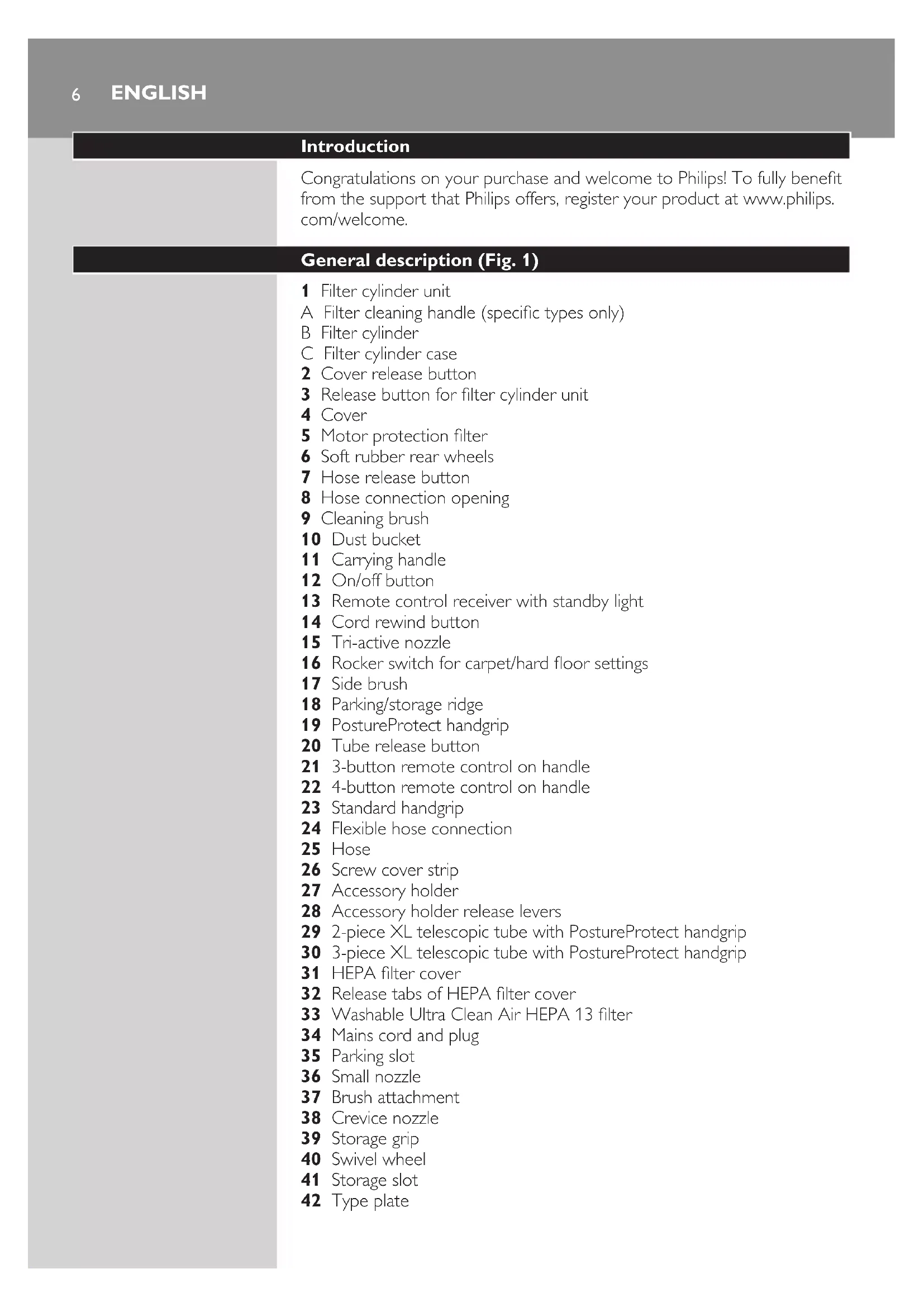 Filter cylinder unit A Filter cleaning handle (specic types only) B Filter cylinder C Filter cylinder case Cover release button Release button for lter cylinder unit Cover Motor protection lter Soft rubber rear wheels Hose release button Hose connection opening Cleaning brush Dust bucket Carrying handle On/off button Remote control receiver with standby light Cord rewind button Tri-active nozzle Rocker switch for carpet/hard oor settings Side brush Parking/storage ridge PostureProtect handgrip Tube release button 3-button remote control on handle 4-button remote control on handle Standard handgrip Flexible hose connection Hose Screw cover strip Accessory holder Accessory holder release levers 2-piece XL telescopic tube with PostureProtect handgrip 3-piece XL telescopic tube with PostureProtect handgrip HEPA lter cover Release tabs of HEPA lter cover Washable Ultra Clean Air HEPA 13 lter Mains cord and plug Parking slot Small nozzle Brush attachment Crevice nozzle Storage grip Swivel wheel Storage slot Type plate