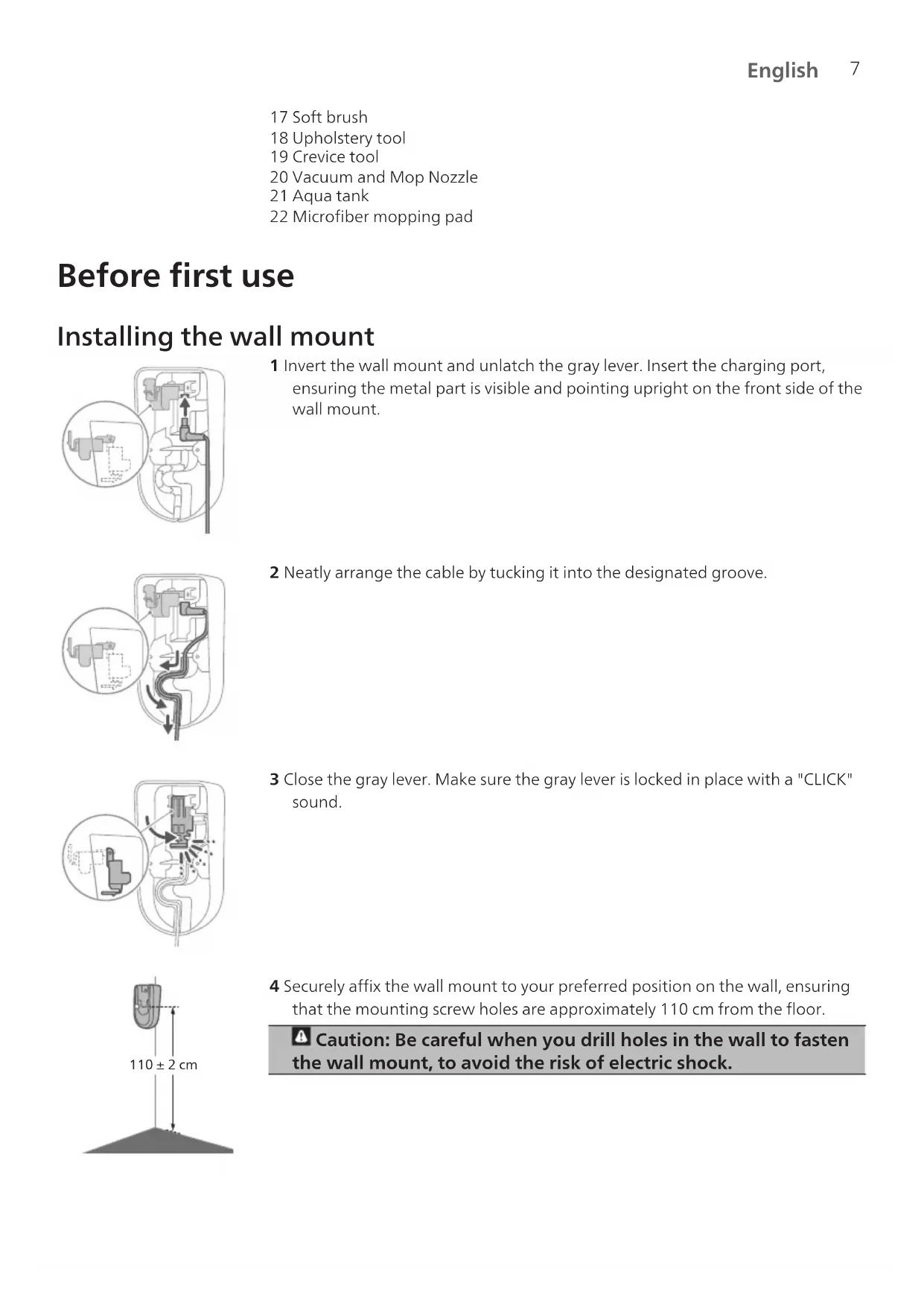English Contents Introduction _______________________________________________________________________________ 6 General description_________________________________________________________________________ 6 Before first use_____________________________________________________________________________ 7 Installing the wall mount ____________________________________________________________________ 7 Preparing for use___________________________________________________________________________ 8 Using the appliance ________________________________________________________________________ 9 Assembling the appliance ___________________________________________________________________ 9 Vacuuming soft and hard floors ______________________________________________________________ 10 Vacuuming while mopping hard floors________________________________________________________ 11 Versatile usage and accessories ______________________________________________________________ 14 Customizations and additional information____________________________________________________ 17 After use – Maintenance ____________________________________________________________________ 19 Frequent maintenance after each cleaning cycle _______________________________________________ 19 Periodic maintenance intermittently __________________________________________________________ 22 Replacement ______________________________________________________________________________ 30 User interface signals and their meaning ______________________________________________________ 31 Troubleshooting ___________________________________________________________________________ 32 Dry cleaning _______________________________________________________________________________ 32 Wet cleaning ______________________________________________________________________________ 36 Introduction Thank you for buying this product! To fully benefit from the support that we offer, register your product at www.philips.com/mycordlessvacuum-8000s. General description 1 Digital display a Ring indicator of battery level b Percentage of battery level c Selected power level d Floor Type Recognition feature activation icon e Filter cleaning reminder icon 2 Menu/Confirm button 3 + Button 4 – Button 5 On/off button 6 Handheld 7 Dust bucket 8 Battery 9 Extra filter (XC8057 only) 10 Dust bucket release button 11 Wallmount 12 Adapter 13 Tube 14 PrecisionPower Smart Nozzle 15 Mini TurboBrush 16 Combination tool7 English 17 Soft brush 18 Upholstery tool 19 Crevice tool 20 Vacuum and Mop Nozzle 21 Aqua tank 22 Microfiber mopping pad Before first use Installing the wall mount 1 Invert the wall mount and unlatch the gray lever. Insert the charging port, ensuring the metal part is visible and pointing upright on the front side of the wall mount. 2 Neatly arrange the cable by tucking it into the designated groove. 3 Close the gray lever. Make sure the gray lever is locked in place with a "CLICK" sound. 110 ± 2 cm 4 Securely affix the wall mount to your preferred position on the wall, ensuring that the mounting screw holes are approximately 110 cm from the floor. Caution: Be careful when you drill holes in the wall to fasten the wall mount, to avoid the risk of electric shock.8 English Note: Verify that the placement of the wall mount allows the entire appliance to hang on the wall without the nozzle coming into contact with the floor. 5 Once you have determined the optimal position and height for storing and charging your appliance, firmly tighten the screws to secure the wall mount in place. Preparing for use The appliance is equipped with a Li-Ion battery. Charging from empty to full takes about 6 hours. 1 Attach the battery pack to the main body of the appliance, ensuring a secure connection that's confirmed with a "CLICK" sound. MAX 40⁰C MIN 5⁰C 2 Charge your appliance by placing it onto the assembled wall mount.