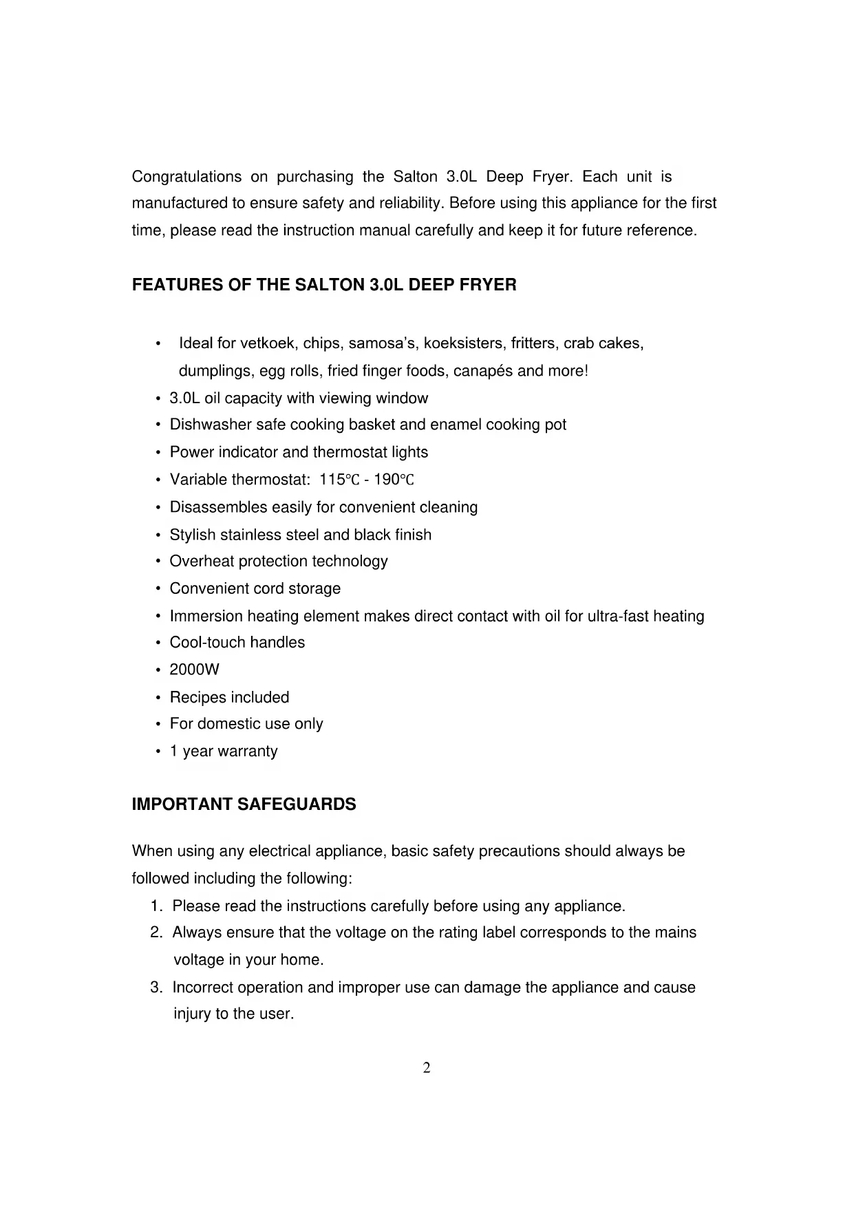 Congratulations on purchasing the Salton 3.0L Deep Fryer. Each unit is manufactured to ensure safety and reliability. Before using this appliance for the first time, please read the instruction manual carefully and keep it for future reference. FEATURES OF THE SALTON 3.0L DEEP FRYER