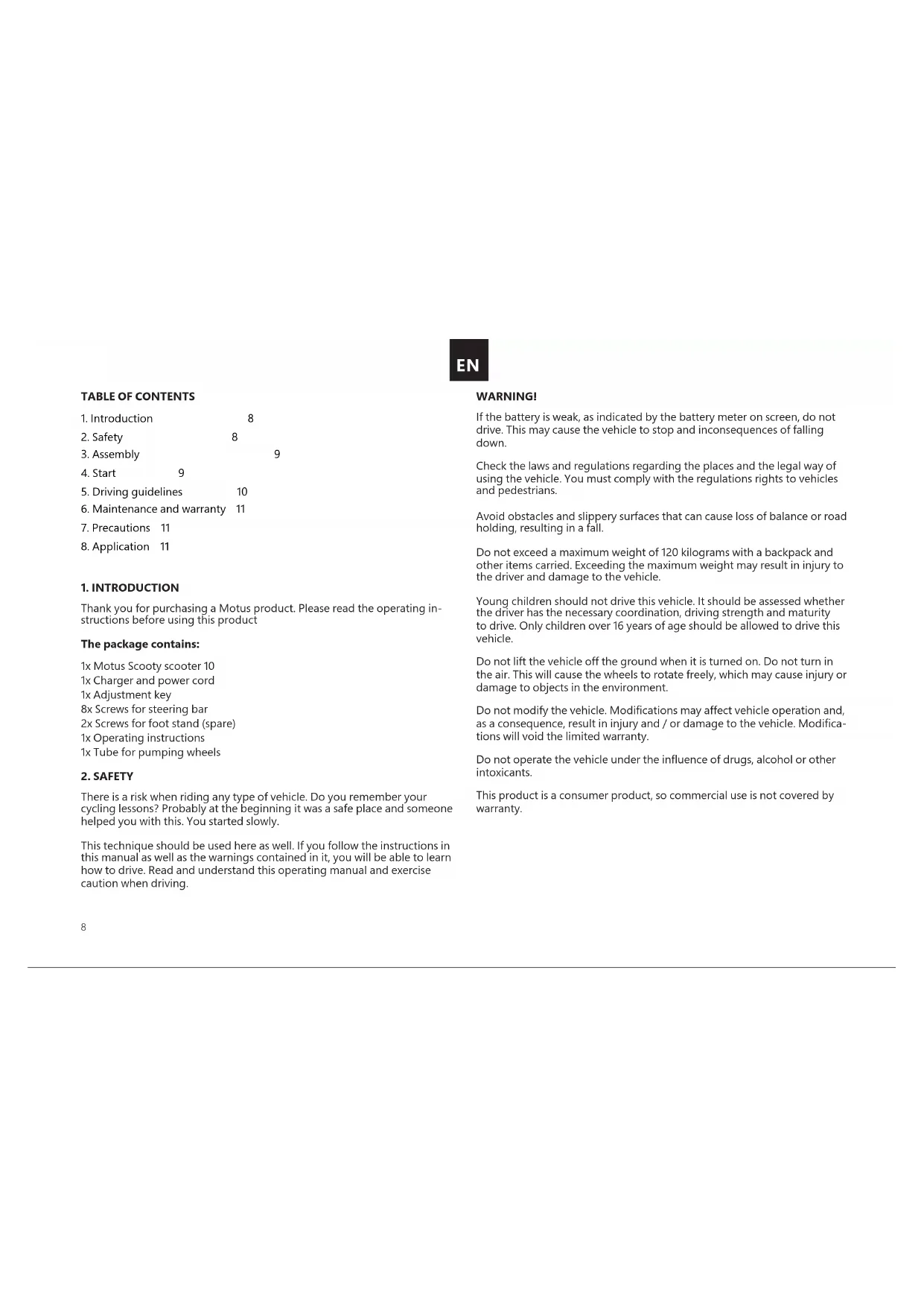 Thank you for purchasing a Motus product. Please read the operating in- structions before using this product The package contains: 1x Motus Scooty scooter 10 1x Charger and power cord 1x Adjustment key 8x Screws for steering bar 2x Screws for foot stand (spare) 1x Operating instructions 1x Tube for pumping wheels