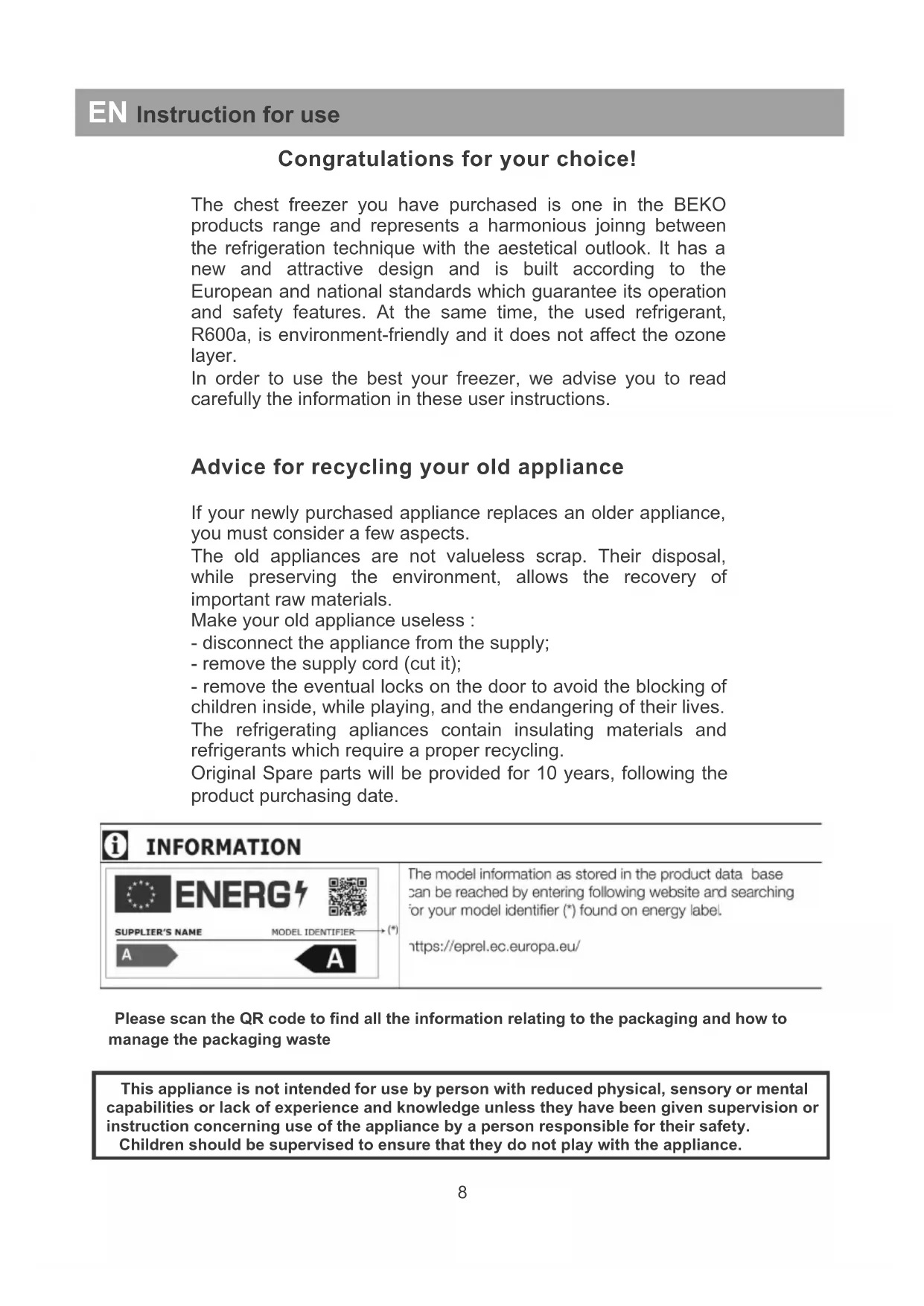 4Congratulations for your choice! The chest freezer you have purchased is one in the BEKO products range and represents a harmonious joinng between the refrigeration technique with the aestetical outlook. It has a new and attractive design and is built according to the European and national standards which guarantee its operation and safety features. At the same time, the used refrigerant, R600a, is environment-friendly and it does not affect the ozone layer. In order to use the best your freezer, we advise you to read carefully the information in these user instructions. Advice for recycling your old appliance If your newly purchased appliance replaces an older appliance, you must consider a few aspects. The old appliances are not valueless scrap. Their disposal, while preserving the environment, allows the recovery of important raw materials. Make your old appliance useless : - disconnect the appliance from the supply; - remove the supply cord (cut it); - remove the eventual locks on the door to avoid the blocking of children inside, while playing, and the endangering of their lives. The refrigerating apliances contain insulating materials and refrigerants which require a proper recycling. Original Spare parts will be provided for 10 years, following the product purchasing date.