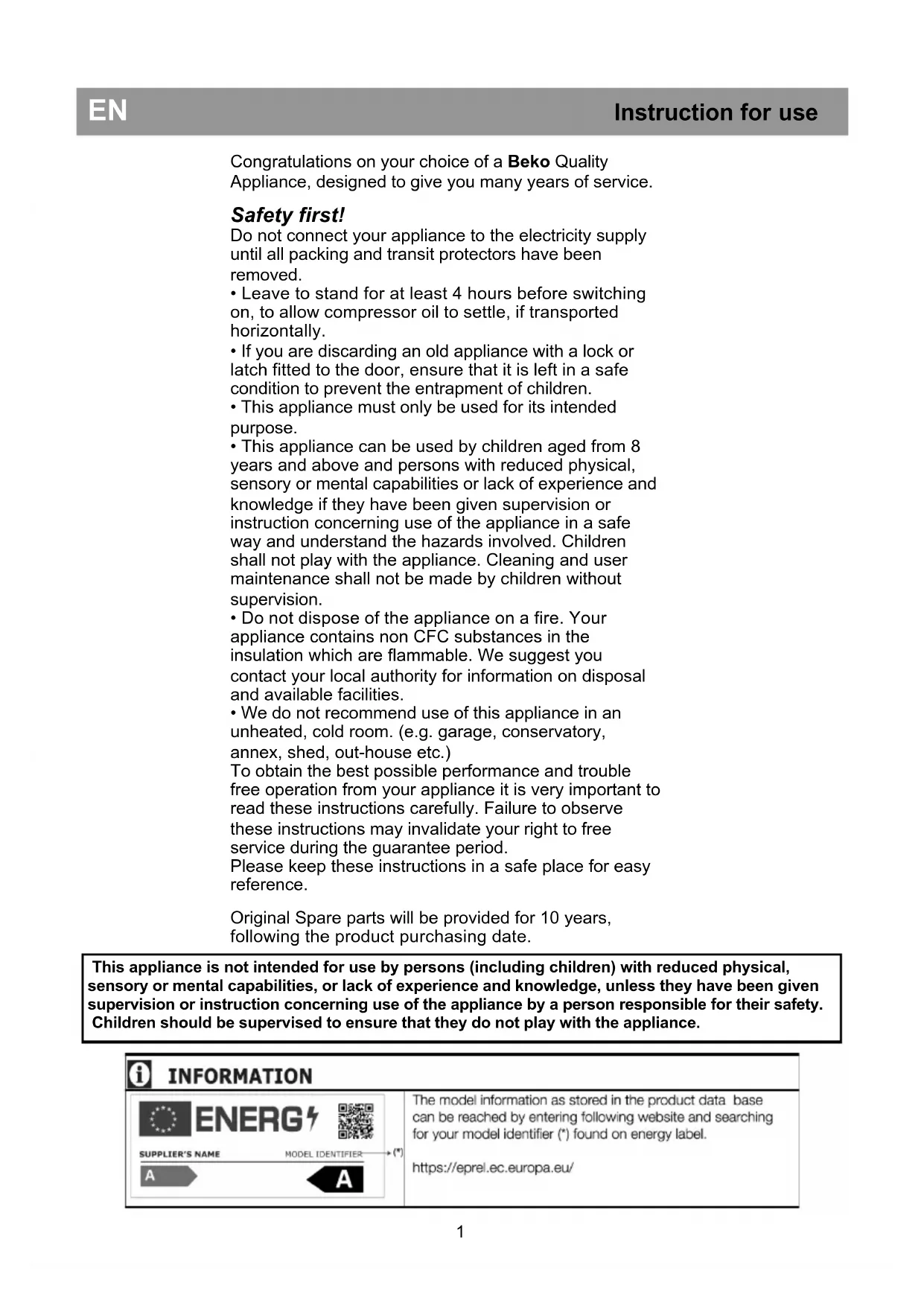 89Congratulations on your choice of a Beko Quality Appliance, designed to give you many years of service. Safety first! Do not connect your appliance to the electricity supply until all packing and transit protectors have been removed.