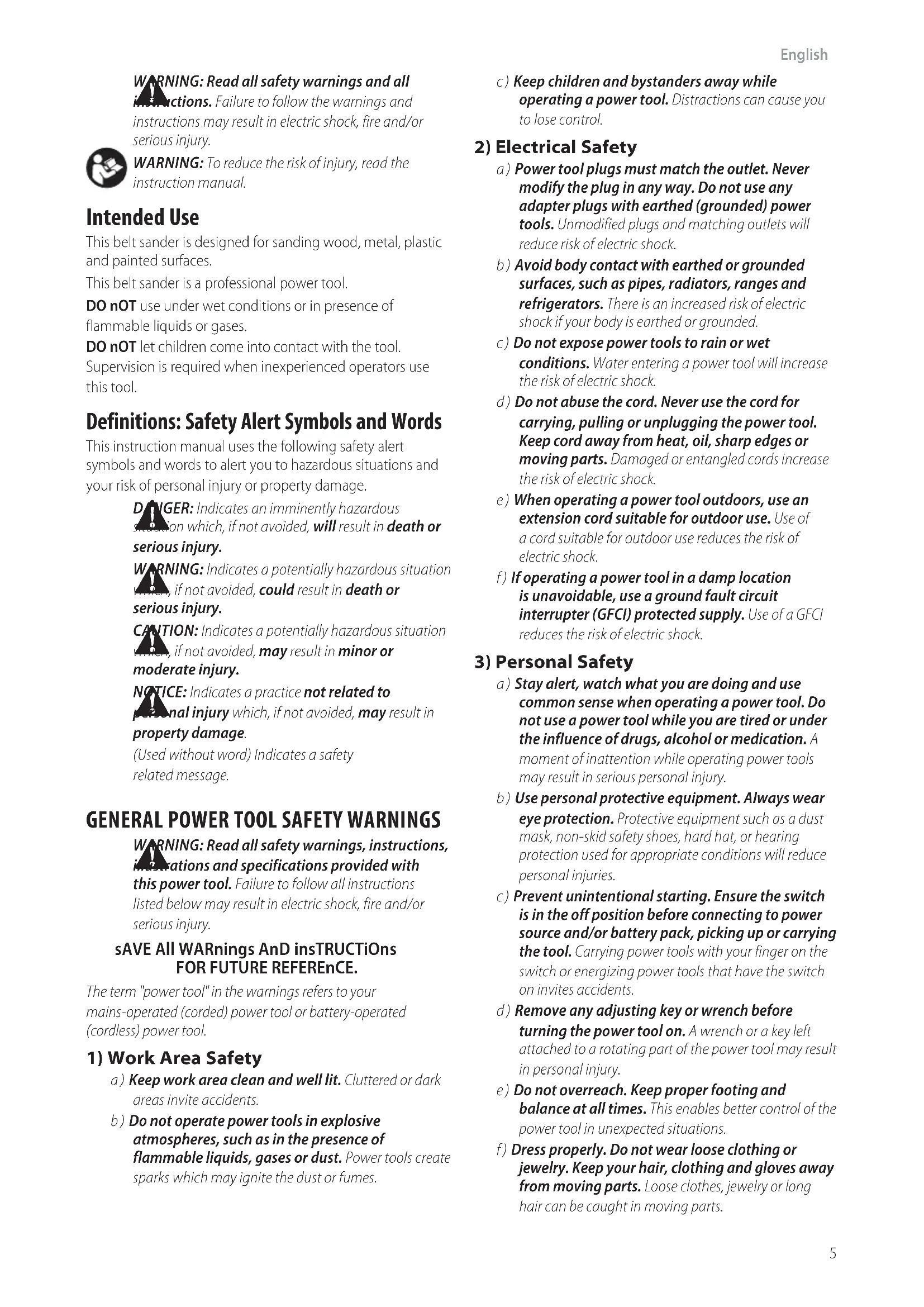 instructionmanual. Intended Use This belt sander is designed for sanding wood, metal, plastic and paintedsurfaces. This belt sander is a professional powertool. DO nOT use under wet conditions or in presence of flammable liquids orgases. DO nOT let children come into contact with the tool. Supervision is required when inexperienced operators use thistool. Definitions: Safety Alert Symbols and Words This instruction manual uses the following safety alert symbols and words to alert you to hazardous situations and your risk of personal injury or propertydamage.