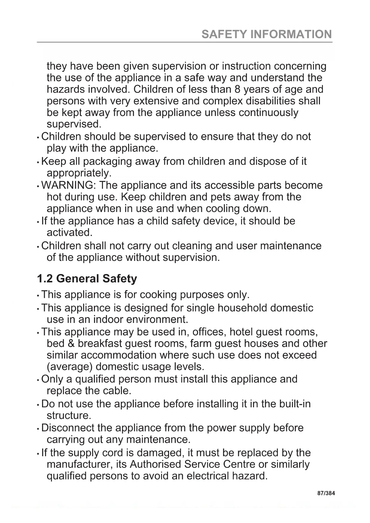 - This appliance can be used by children aged from 8 years and above and persons with reduced physical, sensory or mental capabilities or lack of experience and knowledge if 86/384 SAFETY INFORMATIONthey have been given supervision or instruction concerning the use of the appliance in a safe way and understand the hazards involved. Children of less than 8 years of age and persons with very extensive and complex disabilities shall be kept away from the appliance unless continuously supervised.