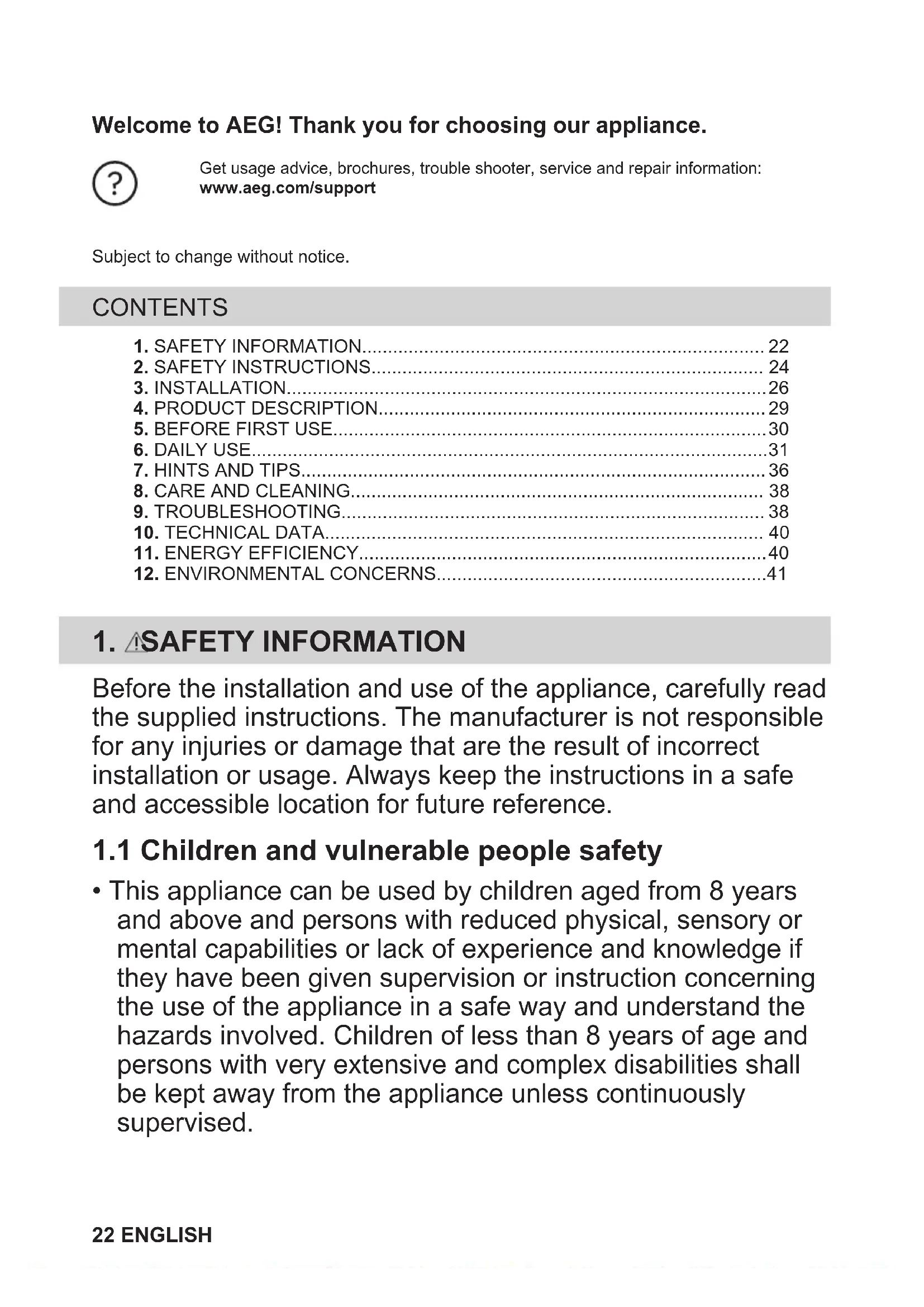 - This appliance can be used by children aged from 8 years and above and persons with reduced physical, sensory or mental capabilities or lack of experience and knowledge if they have been given supervision or instruction concerning the use of the appliance in a safe way and understand the hazards involved. Children of less than 8 years of age and persons with very extensive and complex disabilities shall be kept away from the appliance unless continuously supervised. 22 ENGLISH• Children should be supervised to ensure that they do not play with the appliance.