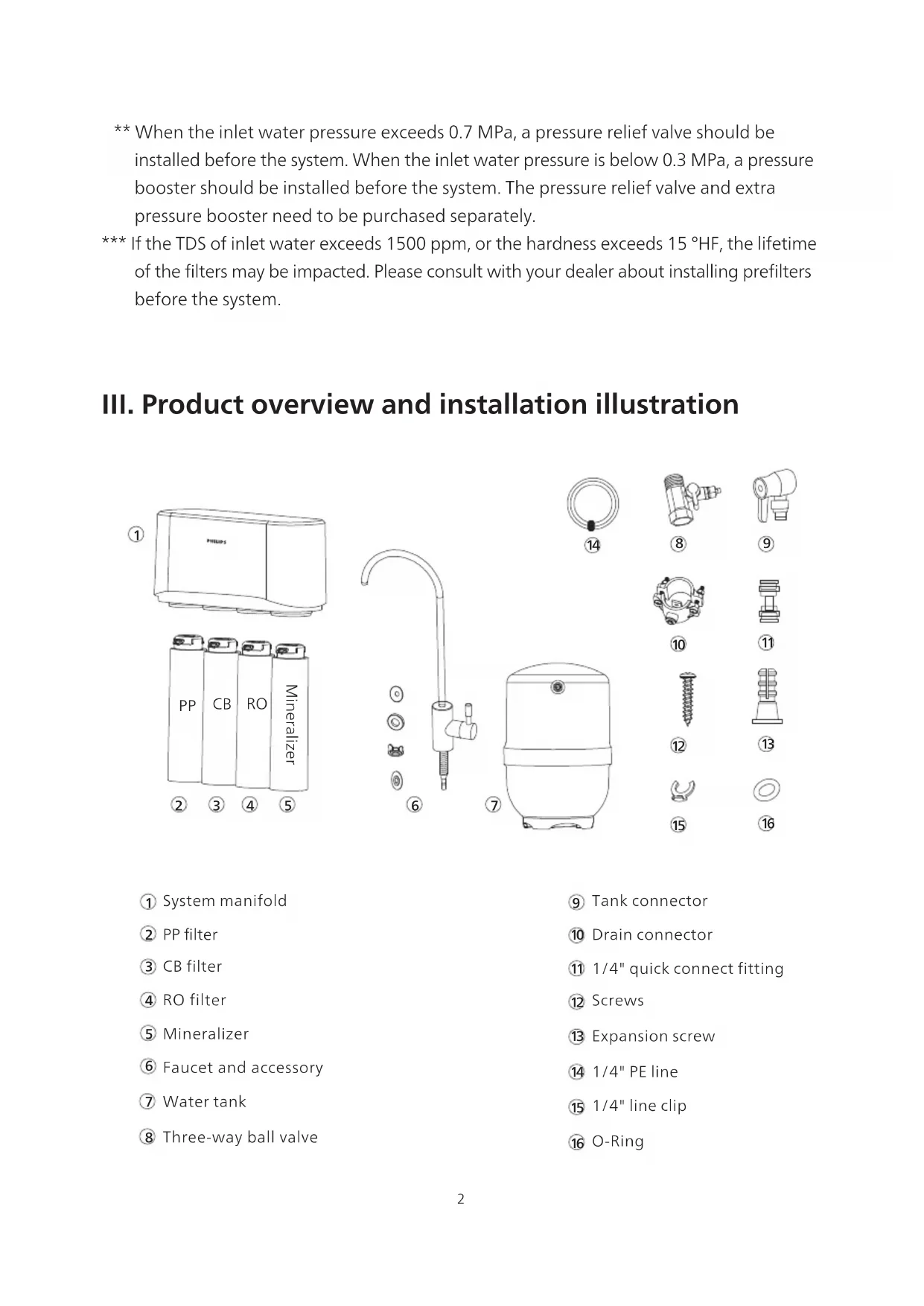 ** When the inlet water pressure exceeds 0.7 MPa, a pressure relief valve should be installed before the system. When the inlet water pressure is below 0.3 MPa, a pressure booster should be installed before the system. The pressure relief valve and extra pressure booster need to be purchased separately. *** If the TDS of inlet water exceeds 1500 ppm, or the hardness exceeds 15 °HF, the lifetime of the lters may be impacted. Please consult with your dealer about installing prelters before the system. CB filter
