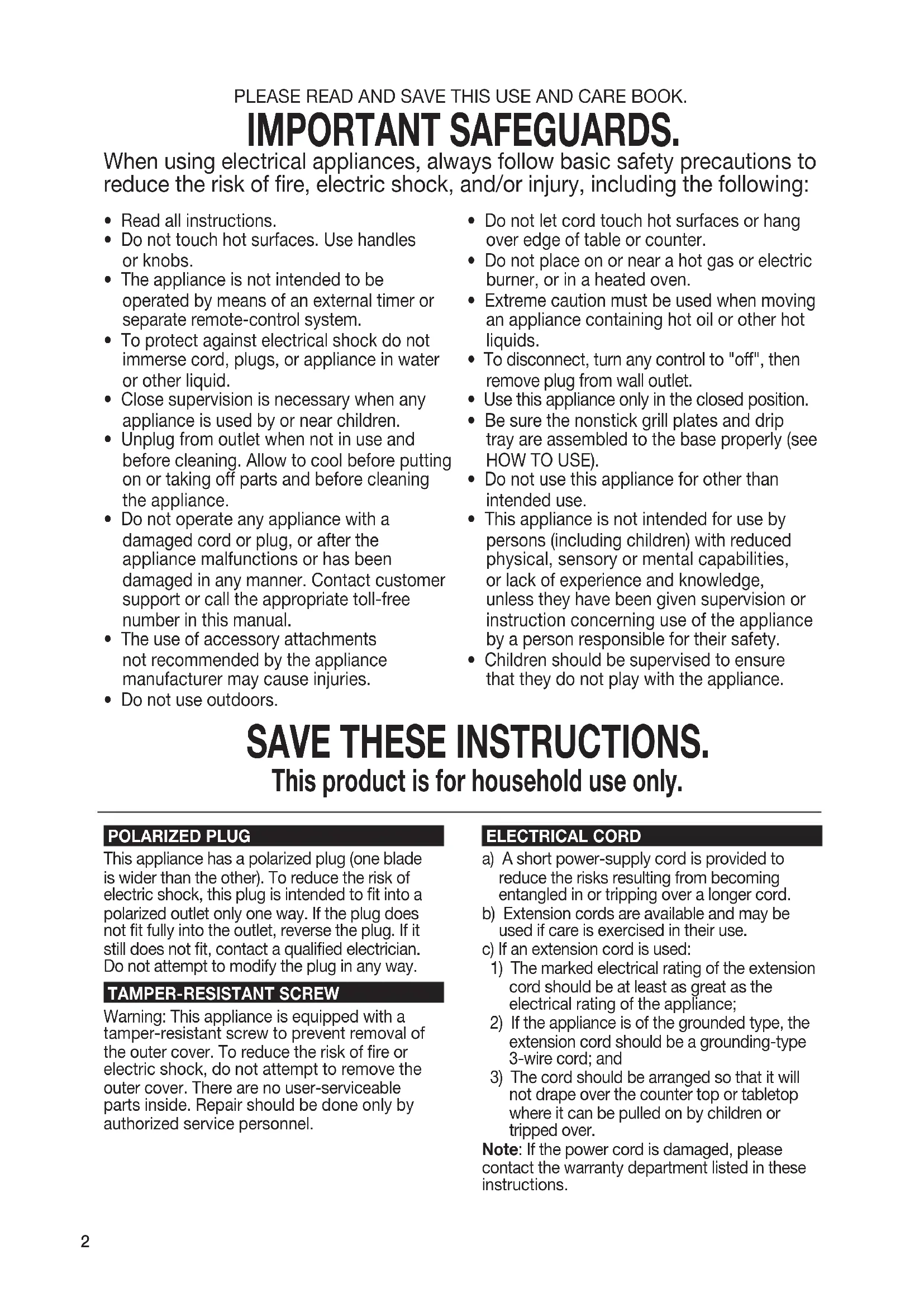 - Children should be supervised to ensure that they do not play with the appliance. PLEASE READ AND SAVE THIS USE AND CARE BOOK. IMPORTANT SAFEGUARDS. When using electrical appliances, always follow basic safety precautions to reduce the risk of fire, electric shock, and/or injury, including the following: SAVE THESE INSTRUCTIONS. This product is for household use only. POLARIZED PLUG This appliance has a polarized plug (one blade is wider than the other). To reduce the risk of electric shock, this plug is intended to t into a polarized outlet only one way. If the plug does not t fully into the outlet, reverse the plug. If it still does not t, contact a qualied electrician. Do not attempt to modify the plug in any way. TAMPER-RESISTANT SCREW