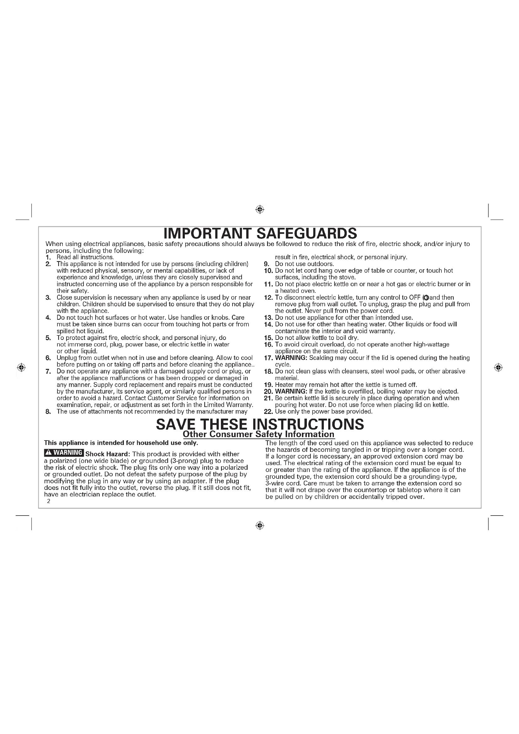 To protect against fire, electric shock, and personal injury, do not immerse cord, plug, power base, or electric kettle in water or other liquid.