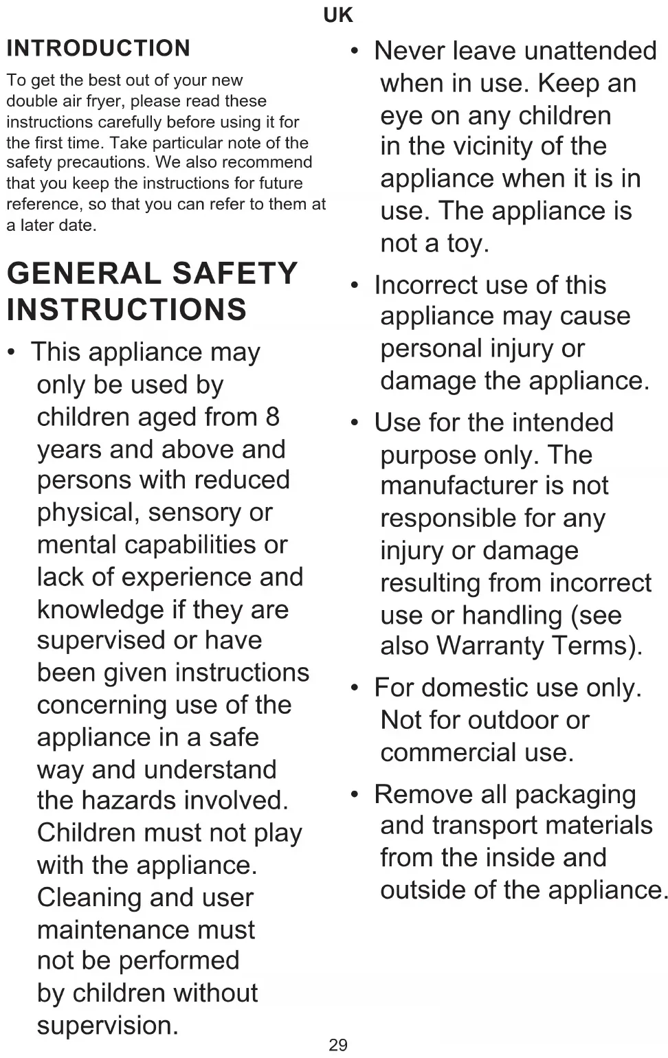 INTRODUCTION To get the best out of your new double air fryer, please read these instructions carefully before using it for the first time. Take particular note of the safety precautions. We also recommend that you keep the instructions for future reference, so that you can refer to them at a later date. GENERAL SAFETY INSTRUCTIONS
