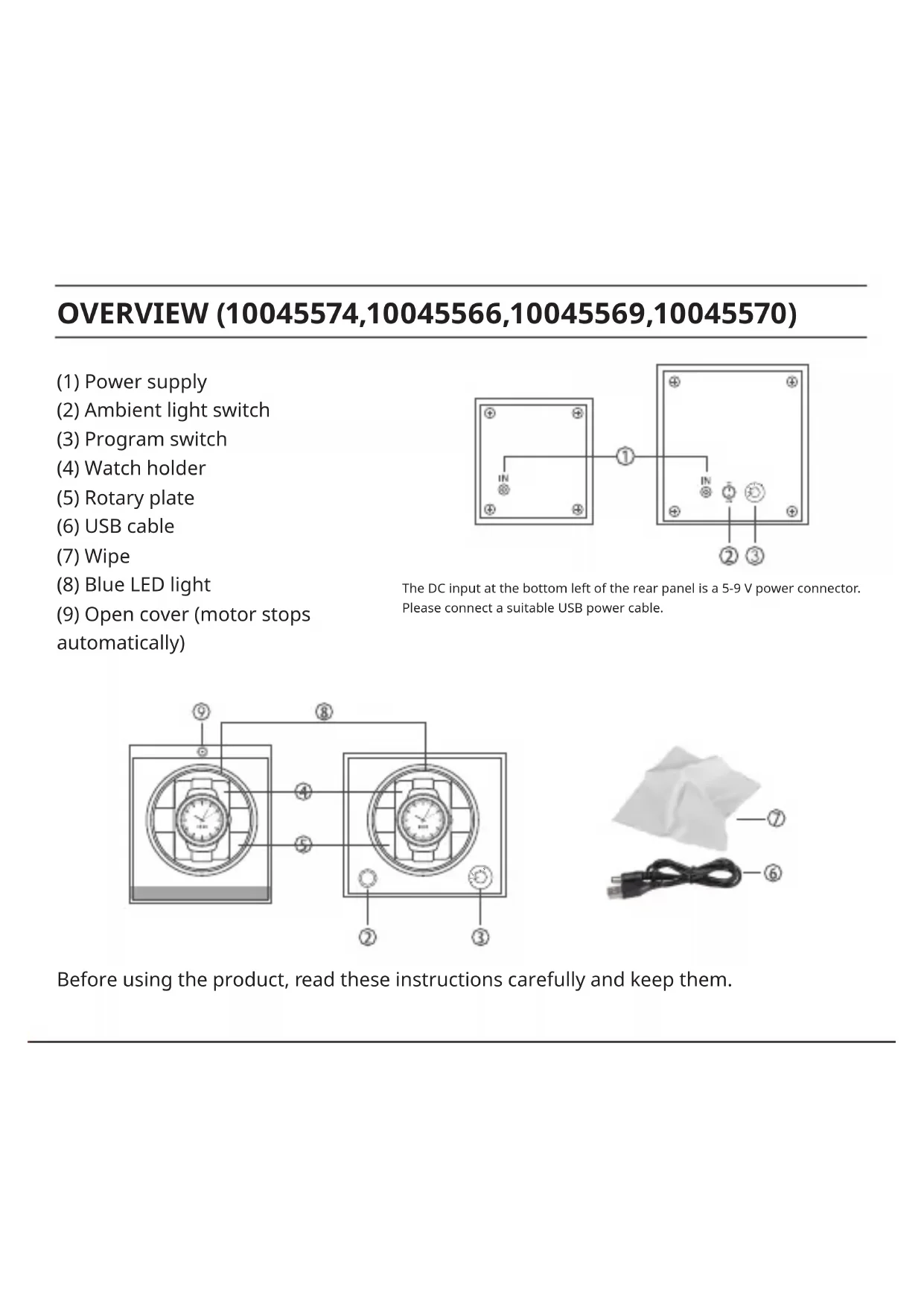 OVERVIEW (10045574,10045566,10045569,10045570) (1) Power supply (2) Ambient light switch (3) Program switch (4) Watch holder (5) Rotary plate (6) USB cable (7) Wipe (8) Blue LED light (9) Open cover (motor stops automatically) Before using the product, read these instructions carefully and keep them. The DC input at the bottom left of the rear panel is a 5-9 V power connector. Please connect a suitable USB power cable.OVERVIEW (10045571,10045572) (1) Open cover (motor stops automatically) (2) Blue LED light (3) Rotary plate (4) Memory foam holder (5) Power supply (6) Ambient light switch (7) Program switch (8) Power switch (9) Charging indicator (SKW167-LIB only) (10) Right rotary plate switch (11) USB cable (12) Wipe The DC input at the bottom left of the rear panel is a 5-9 V power connector. Please connect a suitable USB power cable. Before using the product, read these instructions carefully and keep them.Remove the memory foam holder from the rotary plate, place your watch around it, close the strap and place the holder in the groove. If you cannot place your watch around the holder normally (because the strap is too short), either strap the watch in place with force, as the memory foam can be deformed, or attach the watch to the memory foam holder in a dierent alignment (as shown in the picture below right). Normal watch alignment Alignment for watches with a short strapDEVICE PROPERTIES